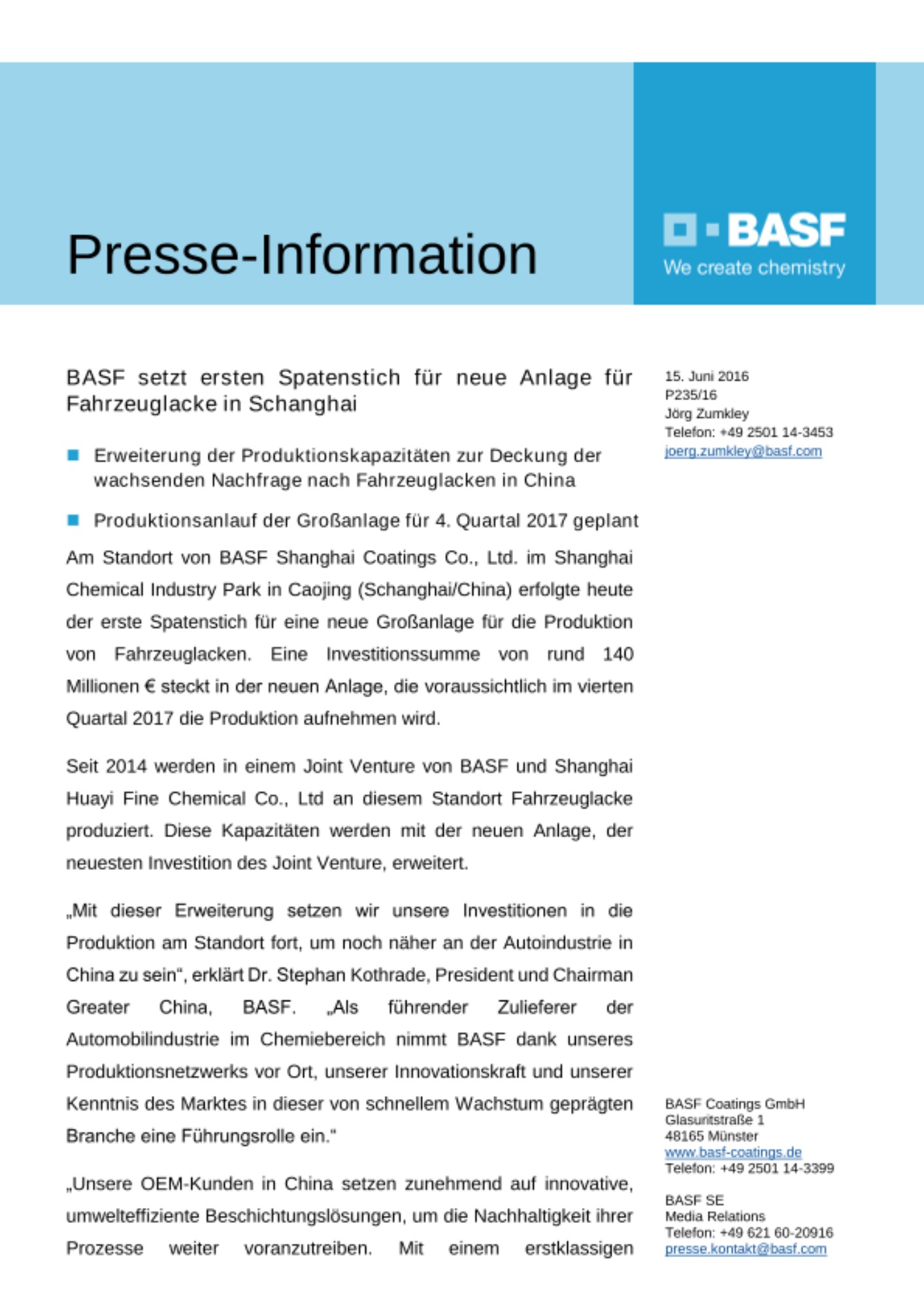 Am Standort von BASF Shanghai Coatings Co., Ltd. im Shanghai Chemical Industry Park in Caojing (Schanghai/China) erfolgte heute der erste Spatenstich für eine neue Großanlage für die Produktion von Fahrzeuglacken. Eine Investitionssumme von rund 140 Millionen € steckt in der neuen Anlage, die voraussichtlich im vierten Quartal 2017 die Produktion aufnehmen wird.