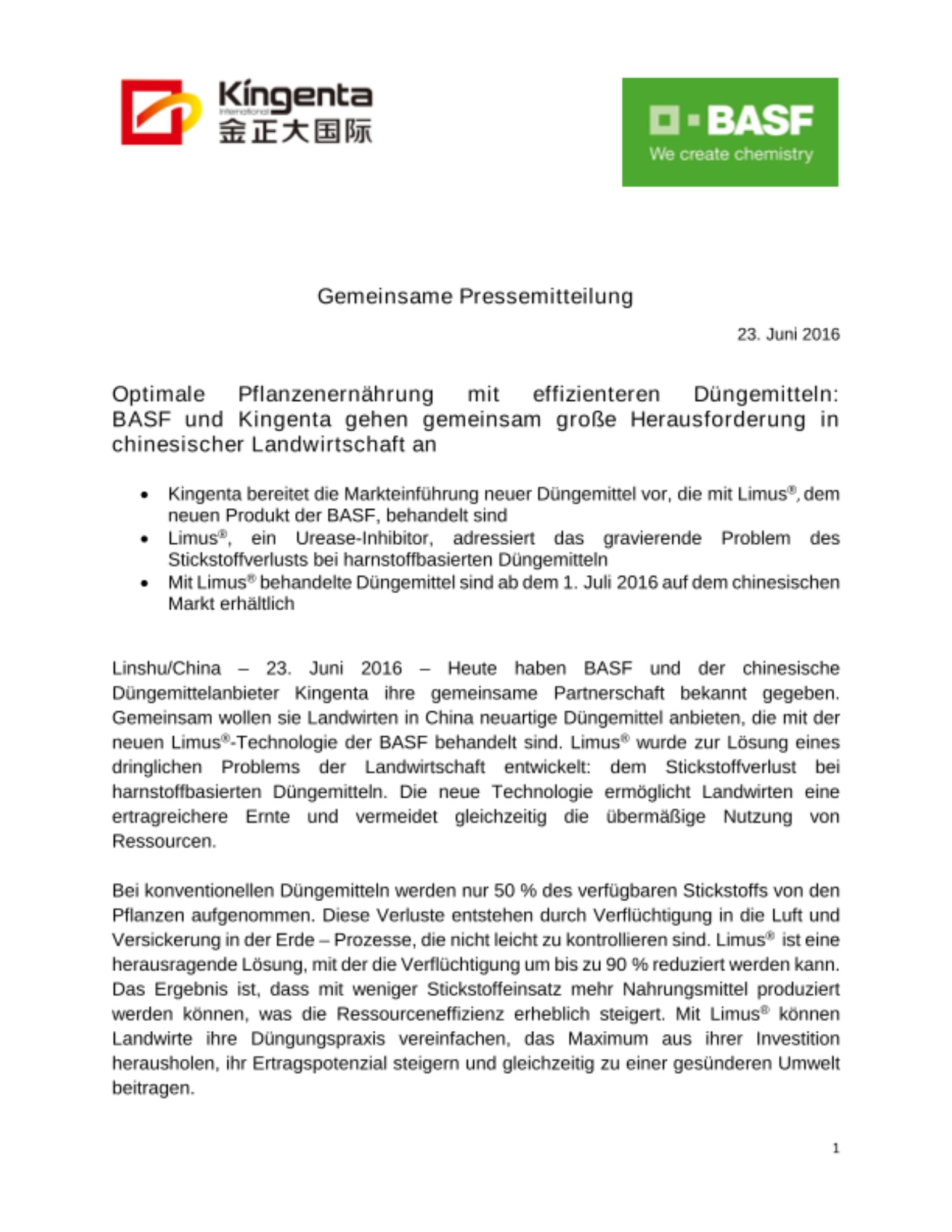 Im Rahmen dieser Partnerschaft stellt BASF Kingenta die Limus®-Technologie zur Verfügung. Kingenta wird ab Juli 2016 mit Limus® behandelte Düngemittel in China auf den Markt bringen.