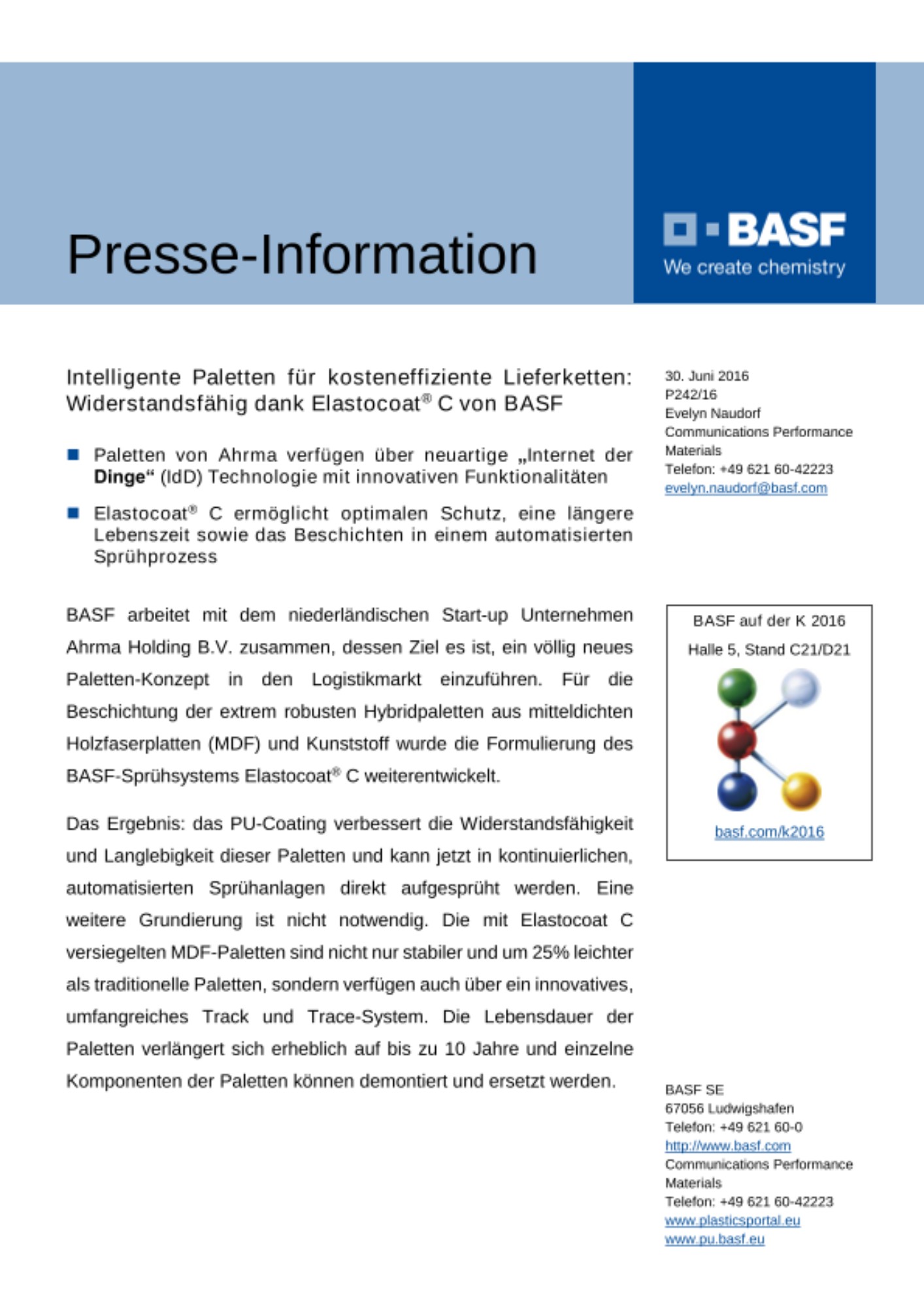 BASF arbeitet mit dem niederländischen Start-up Unternehmen Ahrma Holding B.V. zusammen, dessen Ziel es ist, ein völlig neues Paletten-Konzept in den Logistikmarkt einzuführen. Für die Beschichtung der extrem robusten Hybridpaletten aus mitteldichten Holzfaserplatten (MDF) und Kunststoff wurde die Formulierung des BASF-Sprühsystems Elastocoat® C weiterentwickelt.