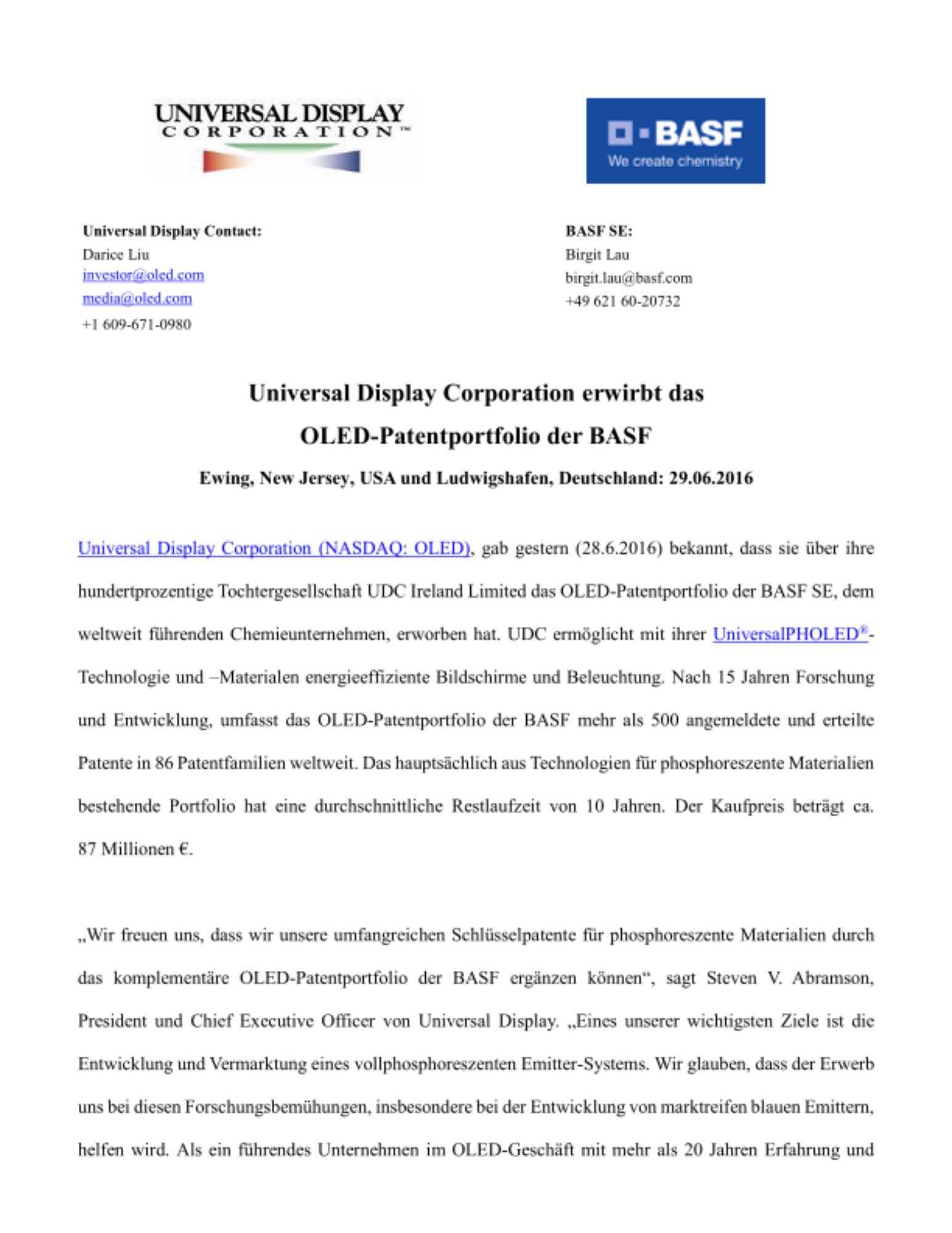 Universal Display Corporation (NASDAQ: OLED), gab gestern (28.6.2016) bekannt, dass sie über ihre hundertprozentige Tochtergesellschaft UDC Ireland Limited das OLED-Patentportfolio der BASF SE, dem weltweit führenden Chemieunternehmen, erworben hat. UDC ermöglicht mit ihrer UniversalPHOLED®-Technologie und –Materialen energieeffiziente Bildschirme und Beleuchtung. Nach 15 Jahren Forschung und Entwicklung, umfasst das OLED-Patentportfolio der BASF mehr als 500 angemeldete und erteilte Patente in 86 Patentfamilien weltweit. Das hauptsächlich aus Technologien für phosphoreszente Materialien bestehende Portfolio hat eine durchschnittliche Restlaufzeit von 10 Jahren. Der Kaufpreis beträgt ca. 87 Millionen €.