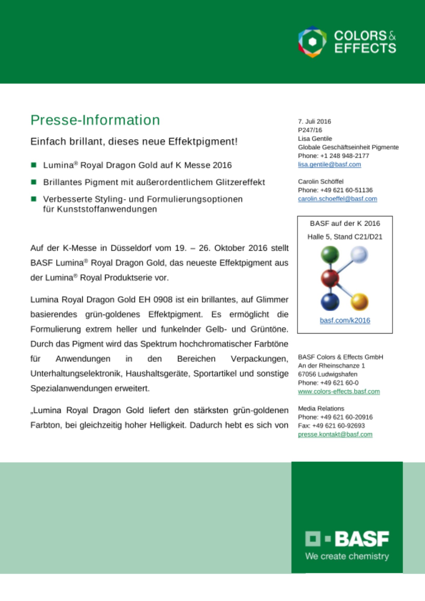 Die Colors & Effects Marke umfasst das breite BASF-Portfolio an Bunt- und Effektpigmenten. Experten der BASF verfügen über ein fundiertes Know-how in den Märkten Lacke, Kunststoffe, Druck, Kosmetik und Landwirtschaft und beraten Kunden lösungsorientiert. Durch unternehmerisches Handeln schaffen sie die Voraussetzungen für Innovation und Wachstum. Für unsere Kunden und unser Unternehmen: We live colors. We boost effects. Weitere Informationen zur Colors & Effects Marke unter: www.colors-effects.basf.com.