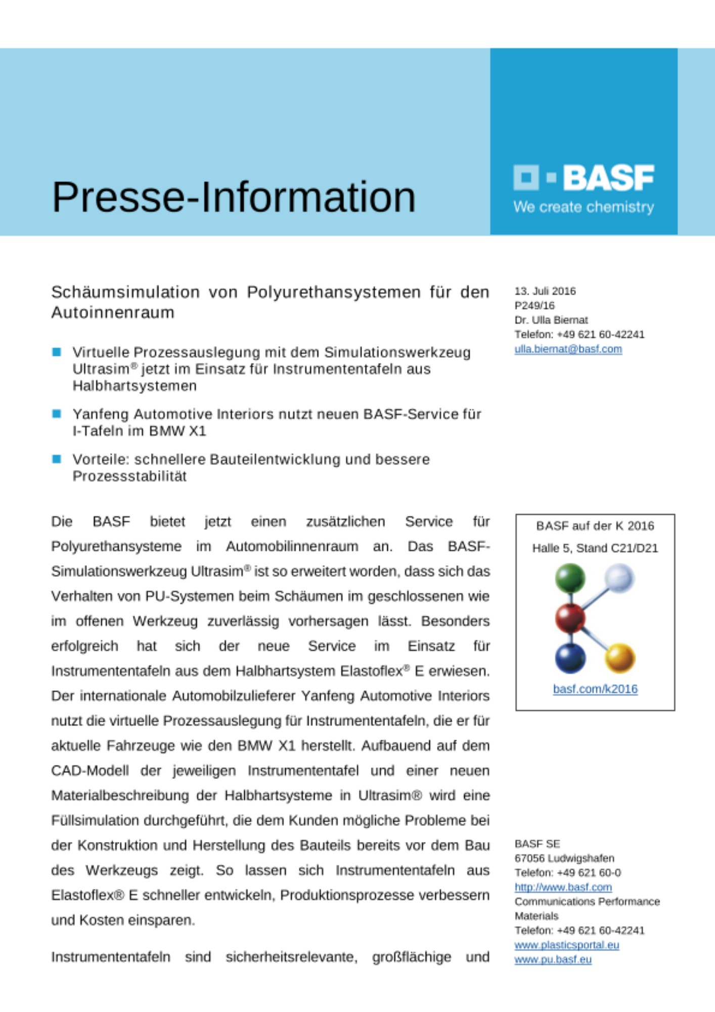 Instrumententafeln sind sicherheitsrelevante, großflächige und komplexe Bauteile, die die Automobilhersteller für jede Automarke einzeln freiprüfen lassen. Bei der Herstellung ist das Schäumen eine wichtige Voraussetzung dafür, dass Träger, Haut, PU-Schaum und das jeweilige Airbagkonzept ein stimmiges Bauteil ergeben. Zusätzlich zu ihrem etablierten technischen Kundenservice ermöglicht BASF mit dem maßgeschneiderten Ultrasim®-Service so die prozess- und bauteilgerechte Verarbeitung des PU-Schaums. Entscheidend dabei ist, dass die Prozessauslegung bereits in einer frühen, noch rein virtuellen Projektphase beginnen kann. Das unterstützt die Kunden maßgeblich dabei, ihre Projektzeiten zu reduzieren, die Werkzeugauslegung zu optimieren sowie eine kosteneffiziente und global ausgerichtete Entwicklung zu planen – und das weltweit.