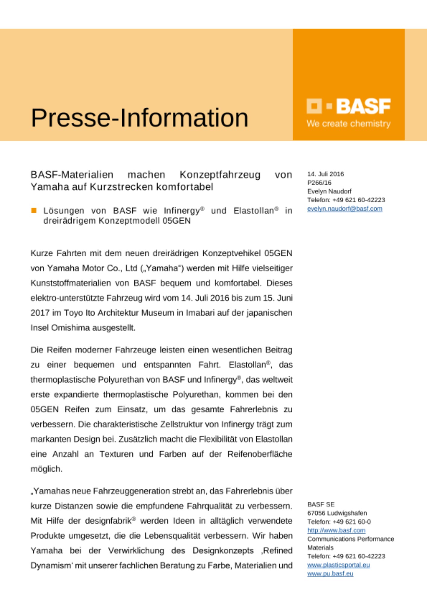 Kurze Fahrten mit dem neuen dreirädrigen Konzeptvehikel 05GEN von Yamaha Motor Co., Ltd („Yamaha“) werden mit Hilfe vielseitiger Kunststoffmaterialien von BASF bequem und komfortabel. Dieses elektro-unterstützte Fahrzeug wird vom 14. Juli 2016 bis zum 15. Juni 2017 im Toyo Ito Architektur Museum in Imabari auf der japanischen Insel Omishima ausgestellt.