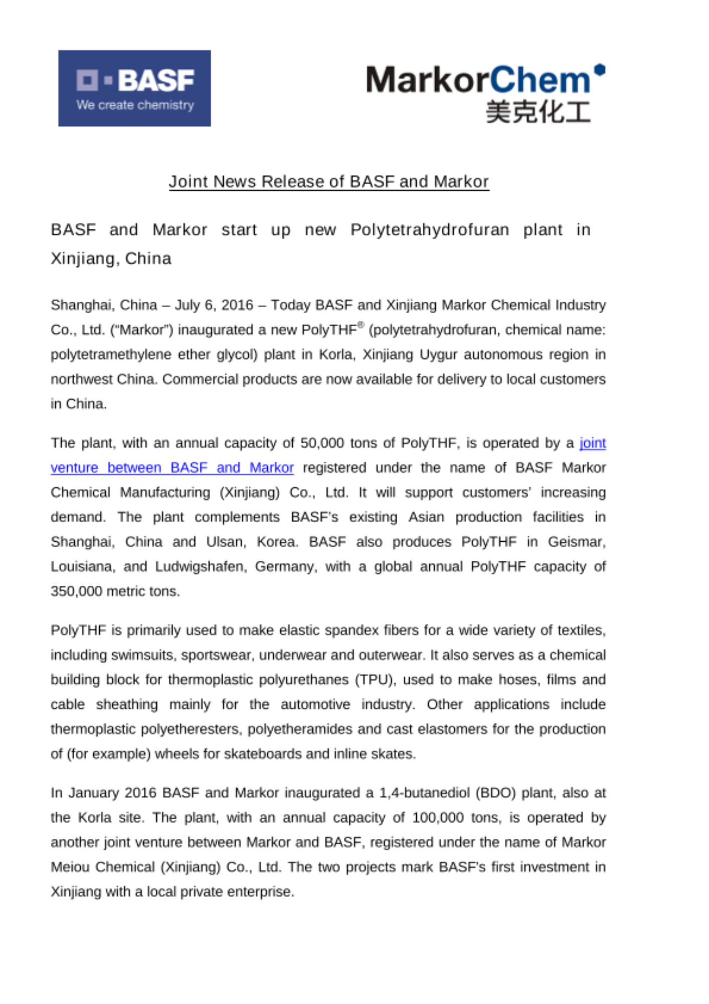 Shanghai, China – July 6, 2016 – Today BASF and Xinjiang Markor Chemical Industry Co., Ltd. (“Markor”) inaugurated a new PolyTHF® (polytetrahydrofuran, chemical name: polytetramethylene ether glycol) plant in Korla, Xinjiang Uygur autonomous region in northwest China. Commercial products are now available for delivery to local customers in China.