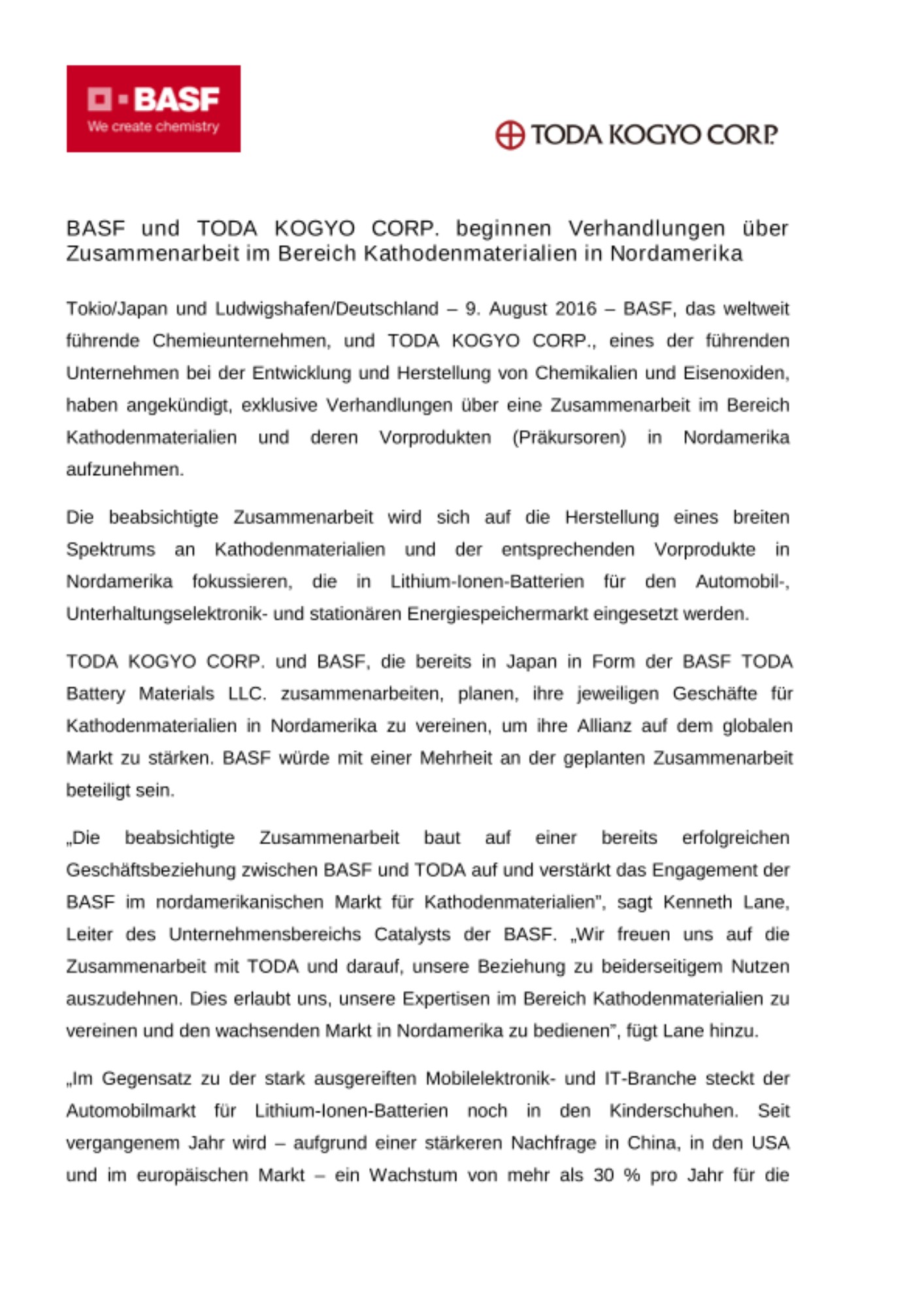 Tokio/Japan und Ludwigshafen/Deutschland – 9. August 2016 – BASF, das weltweit führende Chemieunternehmen, und TODA KOGYO CORP., eines der führenden Unternehmen bei der Entwicklung und Herstellung von Chemikalien und Eisenoxiden, haben angekündigt, exklusive Verhandlungen über eine Zusammenarbeit im Bereich Kathodenmaterialien und deren Vorprodukten (Präkursoren) in Nordamerika aufzunehmen.