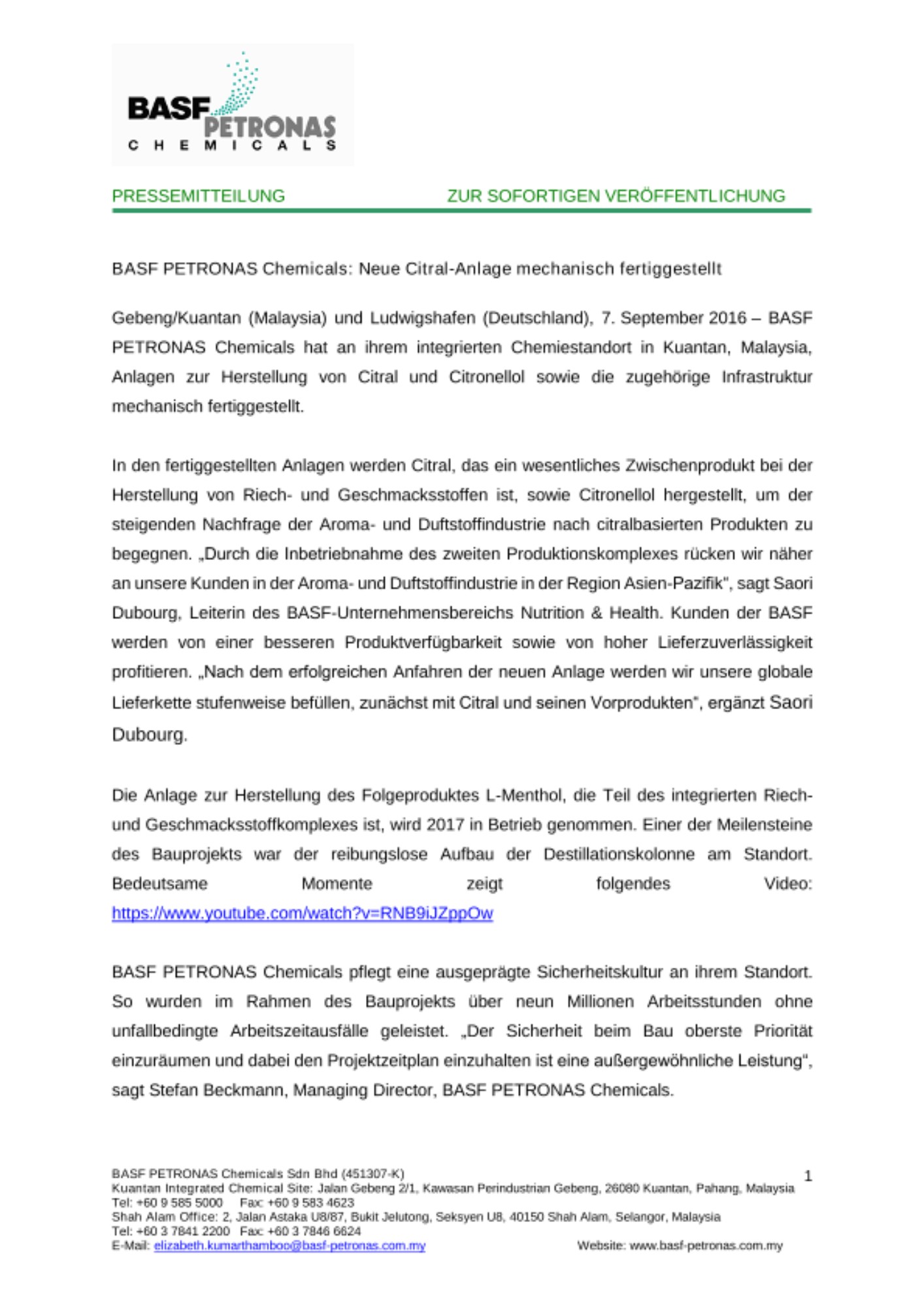 Gebeng/Kuantan (Malaysia) und Ludwigshafen (Deutschland), 7. September 2016 – BASF PETRONAS Chemicals hat an ihrem integrierten Chemiestandort in Kuantan, Malaysia, Anlagen zur Herstellung von Citral und Citronellol sowie die zugehörige Infrastruktur mechanisch fertiggestellt.