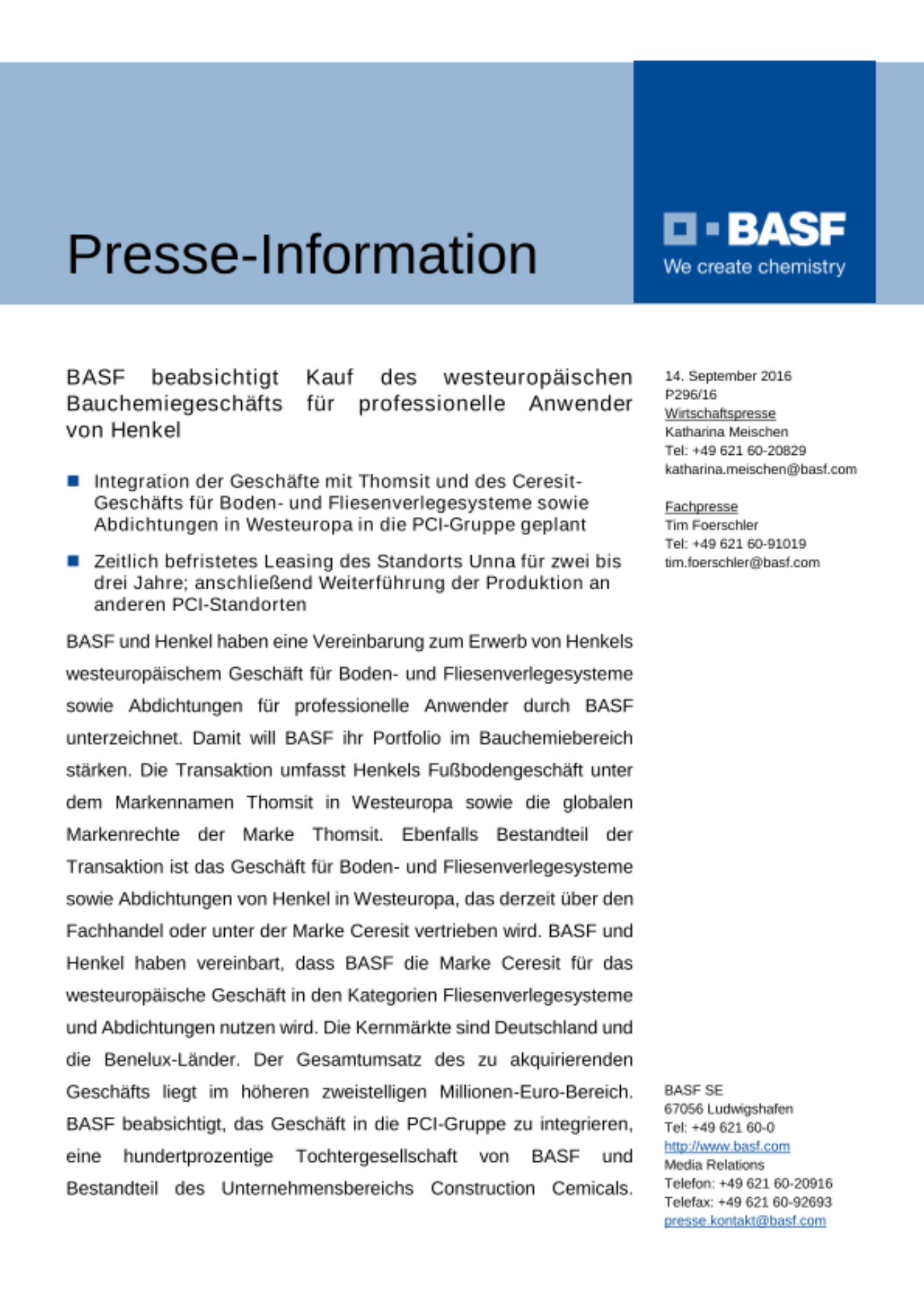 BASF und Henkel haben eine Vereinbarung zum Erwerb von Henkels westeuropäischem Geschäft für Boden- und Fliesenverlegesysteme sowie Abdichtungen für professionelle Anwender durch BASF unterzeichnet. Damit will BASF ihr Portfolio im Bauchemiebereich stärken. Die Transaktion umfasst Henkels Fußbodengeschäft unter dem Markennamen Thomsit in Westeuropa sowie die globalen Markenrechte der Marke Thomsit. Ebenfalls Bestandteil der Transaktion ist das Geschäft für Boden- und Fliesenverlegesysteme sowie Abdichtungen von Henkel in Westeuropa, das derzeit über den Fachhandel oder unter der Marke Ceresit vertrieben wird. BASF und Henkel haben vereinbart, dass BASF die Marke Ceresit für das westeuropäische Geschäft in den Kategorien Fliesenverlegesysteme und Abdichtungen nutzen wird. Die Kernmärkte sind Deutschland und die Benelux-Länder. Der Gesamtumsatz des zu akquirierenden Geschäfts liegt im höheren zweistelligen Millionen-Euro-Bereich. BASF beabsichtigt, das Geschäft in die PCI-Gruppe zu integrieren, eine hundertprozentige Tochtergesellschaft von BASF und Bestandteil des Unternehmensbereichs Construction Cemicals. Die PCI-Gruppe hat eine führende Position im deutschen Markt für Fliesenverlegesysteme.