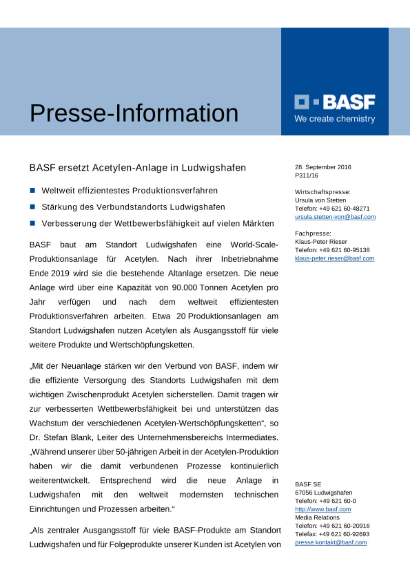 BASF baut am Standort Ludwigshafen eine World-Scale-Produktionsanlage für Acetylen. Nach ihrer Inbetriebnahme Ende 2019 wird sie die bestehende Altanlage ersetzen. Die neue Anlage wird über eine Kapazität von 90.000 Tonnen Acetylen pro Jahr verfügen und nach dem weltweit effizientesten Produktionsverfahren arbeiten. Etwa 20 Produktionsanlagen am Standort Ludwigshafen nutzen Acetylen als Ausgangsstoff für viele weitere Produkte und Wertschöpfungsketten.