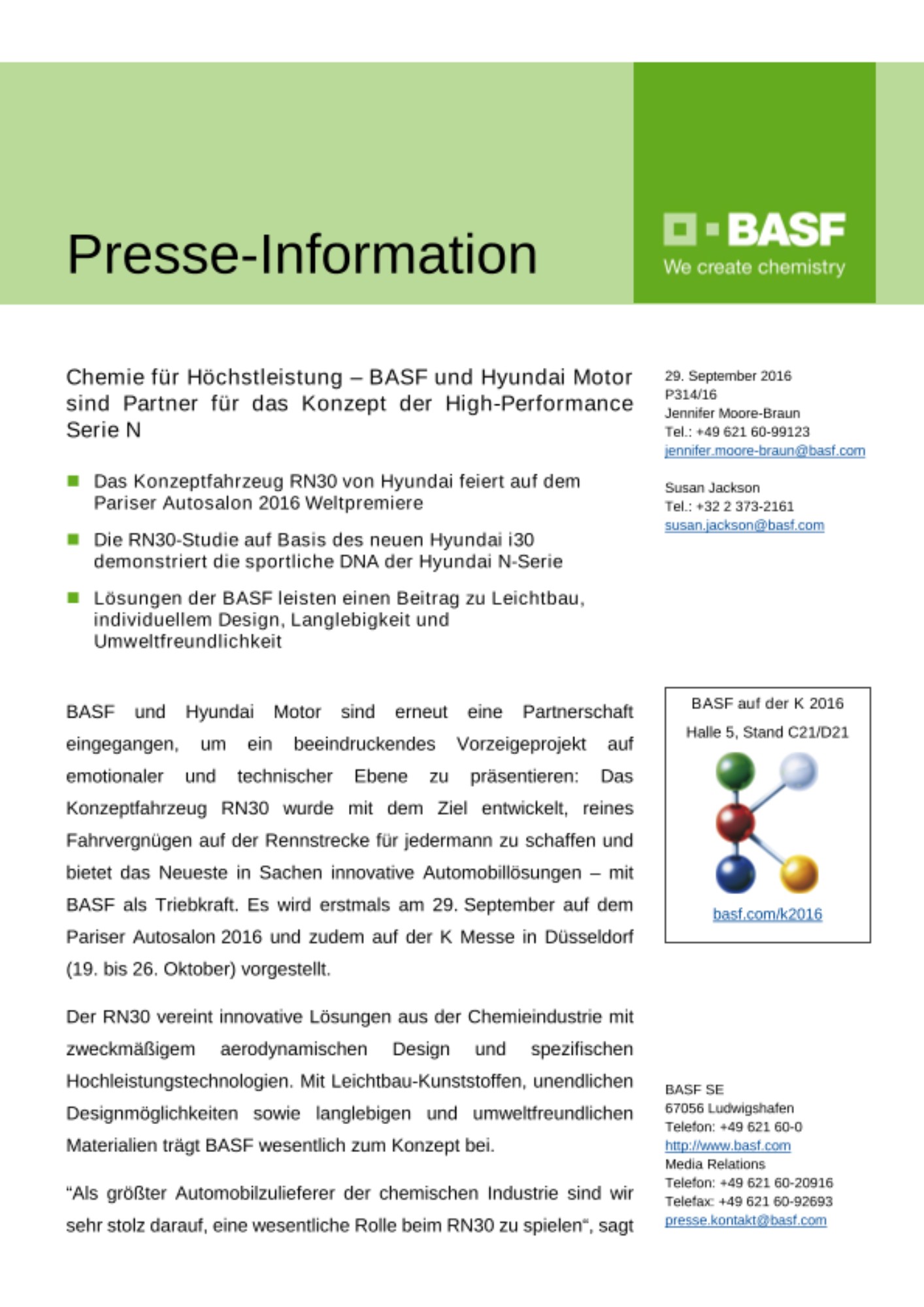 BASF und Hyundai Motor sind erneut eine Partnerschaft eingegangen, um ein beeindruckendes Vorzeigeprojekt auf emotionaler und technischer Ebene zu präsentieren: Das Konzeptfahrzeug RN30 wurde mit dem Ziel entwickelt, reines Fahrvergnügen auf der Rennstrecke für jedermann zu schaffen und bietet das Neueste in Sachen innovative Automobillösungen – mit BASF als Triebkraft. Es wird erstmals am 29. September auf dem Pariser Autosalon 2016 und zudem auf der K Messe in Düsseldorf (19. bis 26. Oktober) vorgestellt.