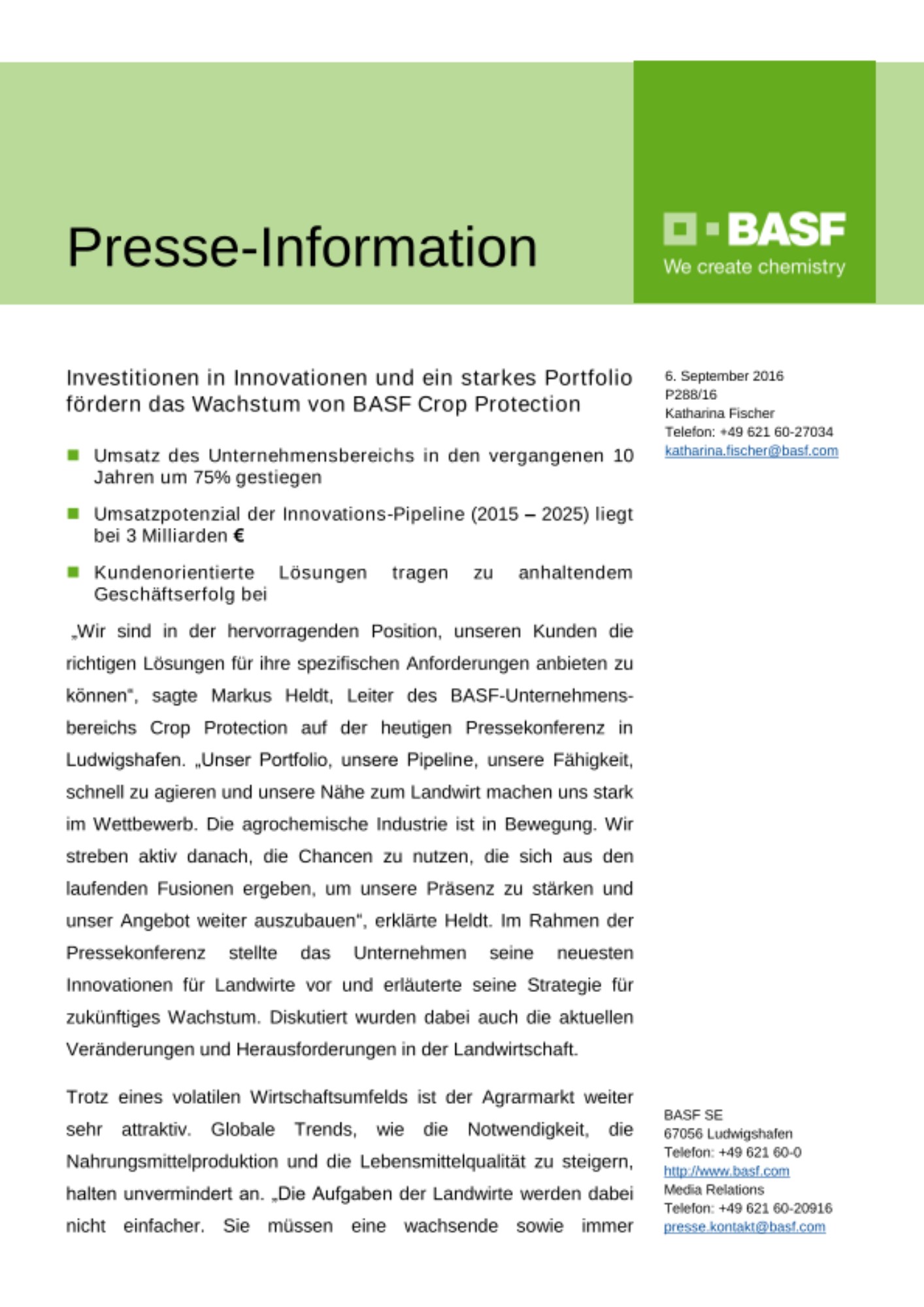 Trotz eines volatilen Wirtschaftsumfelds ist der Agrarmarkt weiter sehr attraktiv. Globale Trends, wie die Notwendigkeit, die Nahrungsmittelproduktion und die Lebensmittelqualität zu steigern, halten unvermindert an. „Die Aufgaben der Landwirte werden dabei nicht einfacher. Sie müssen eine wachsende sowie immer wohlhabendere und anspruchsvollere Bevölkerung ernähren. Der Bedarf an neuen Technologien, wie wir sie bieten, wird auch in Zukunft hoch sein“, so Heldt. Um Landwirte bestmöglich zu unterstützen und weiter im Markt zu wachsen, investiert BASF umfassend in die eigene Forschung und Entwicklung. Darüber hinaus wird das Unternehmen die Pipeline mit neuen Innovationen weiter stärken und in Partnerschaften die Entwicklung neuer Technologien beschleunigen. „Wir werden unsere globale Präsenz verstärken und gleichzeitig die Profitabilität unseres Geschäfts und unseren langfristigen Erfolg sichern. Wir sind der Überzeugung, dass nicht die Unternehmensgröße alleine, sondern Kundenorientierung und Agilität die entscheidenden Faktoren für unser Wachstum sind, denn die Anforderungen der Landwirte verändern sich schnell“, sagte Heldt.