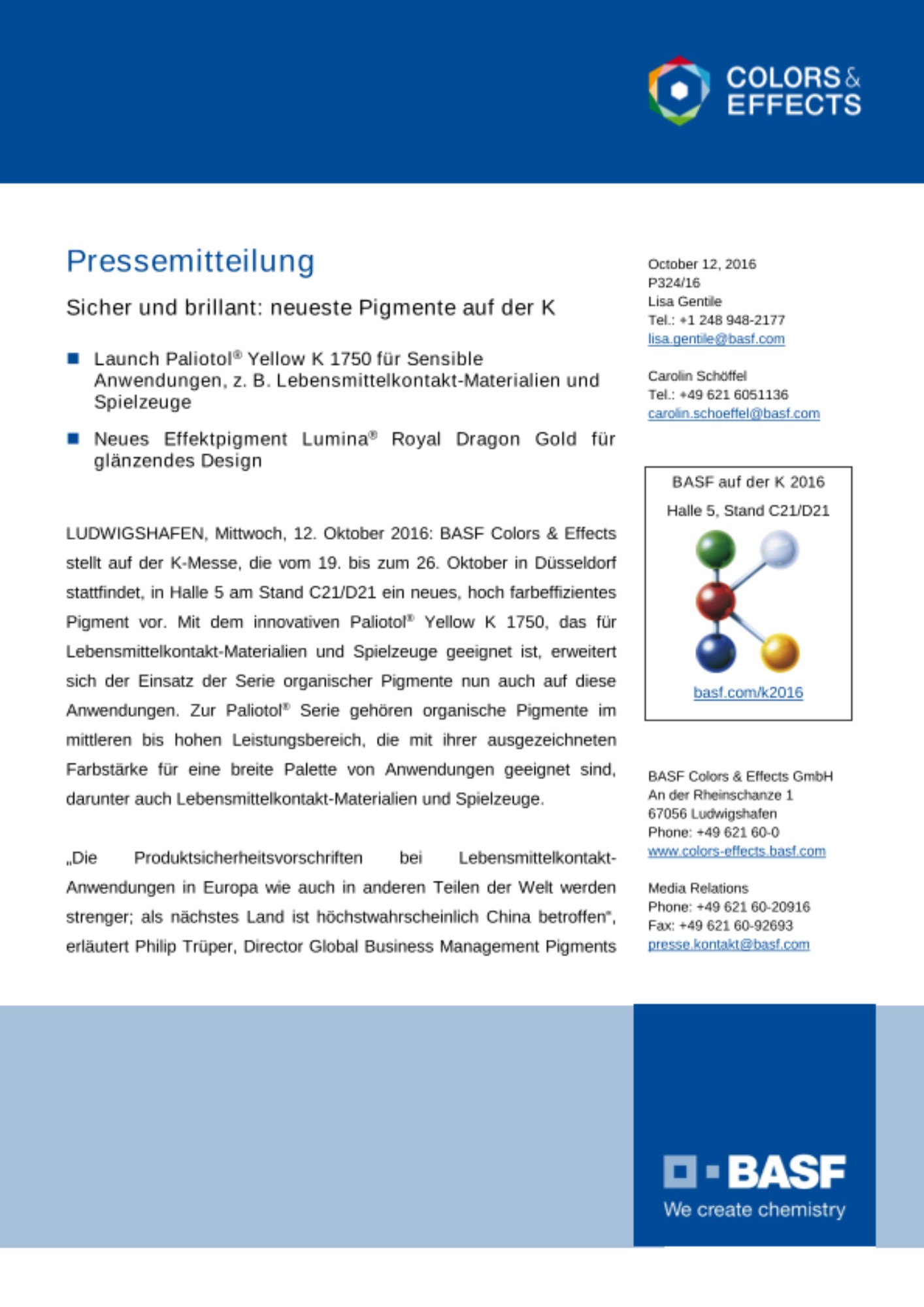 LUDWIGSHAFEN, Mittwoch, 12. Oktober 2016: BASF Colors & Effects stellt auf der K-Messe, die vom 19. bis zum 26. Oktober in Düsseldorf stattfindet, in Halle 5 am Stand C21/D21 ein neues, hoch farbeffizientes Pigment vor. Mit dem innovativen Paliotol® Yellow K 1750, das für Lebensmittelkontakt-Materialien und Spielzeuge geeignet ist, erweitert sich der Einsatz der Serie organischer Pigmente nun auch auf diese Anwendungen. Zur Paliotol® Serie gehören organische Pigmente im mittleren bis hohen Leistungsbereich, die mit ihrer ausgezeichneten Farbstärke für eine breite Palette von Anwendungen geeignet sind, darunter auch Lebensmittelkontakt-Materialien und Spielzeuge.