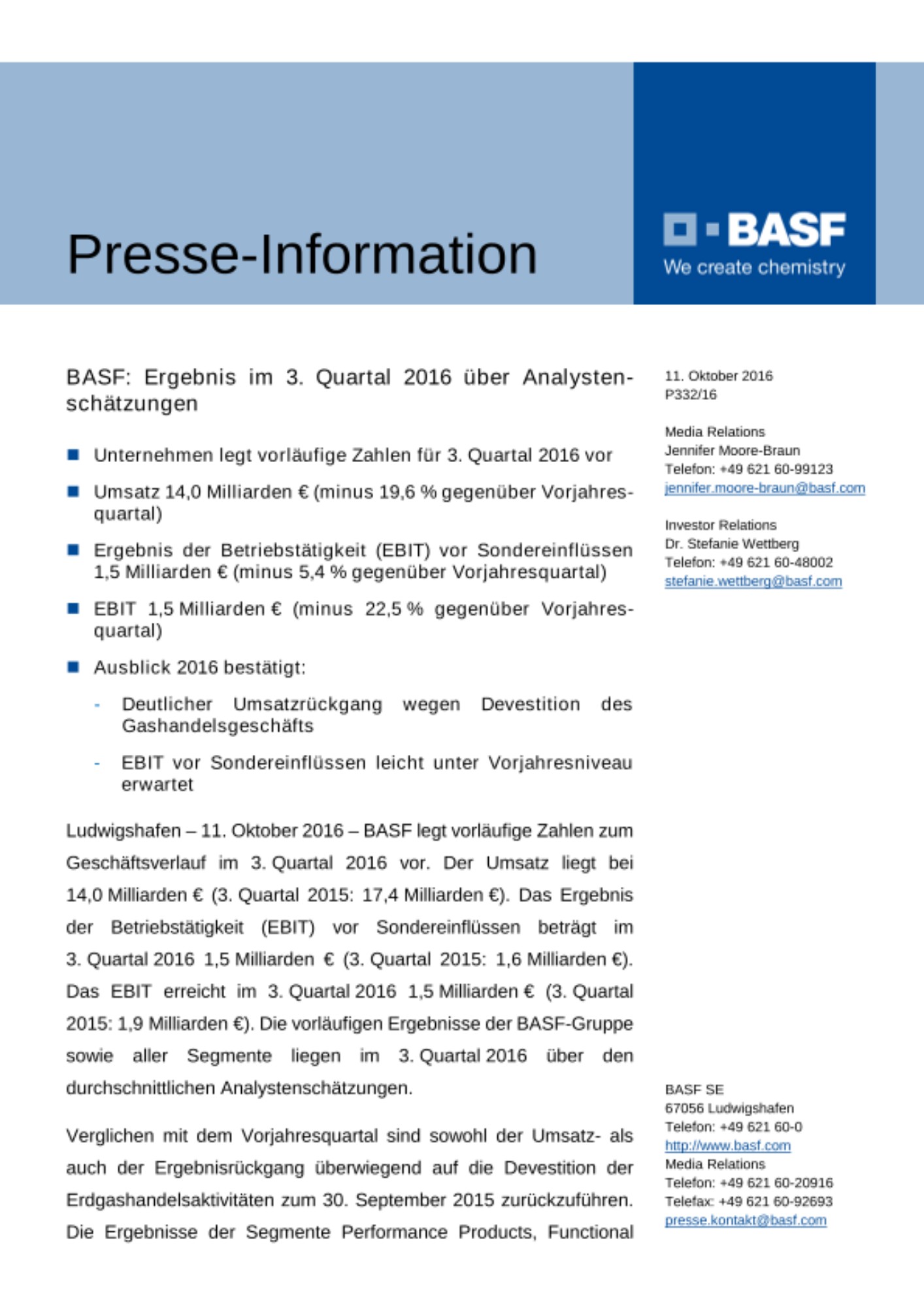 Ludwigshafen – 11. Oktober 2016 – BASF legt vorläufige Zahlen zum Geschäftsverlauf im 3. Quartal 2016 vor. Der Umsatz liegt bei 14,0 Milliarden € (3. Quartal 2015: 17,4 Milliarden €). Das Ergebnis der Betriebstätigkeit (EBIT) vor Sondereinflüssen beträgt im 3. Quartal 2016 1,5 Milliarden € (3. Quartal 2015: 1,6 Milliarden €). Das EBIT erreicht im 3. Quartal 2016 1,5 Milliarden € (3. Quartal 2015: 1,9 Milliarden €). Die vorläufigen Ergebnisse der BASF-Gruppe sowie aller Segmente liegen im 3. Quartal 2016 über den durchschnittlichen Analystenschätzungen.