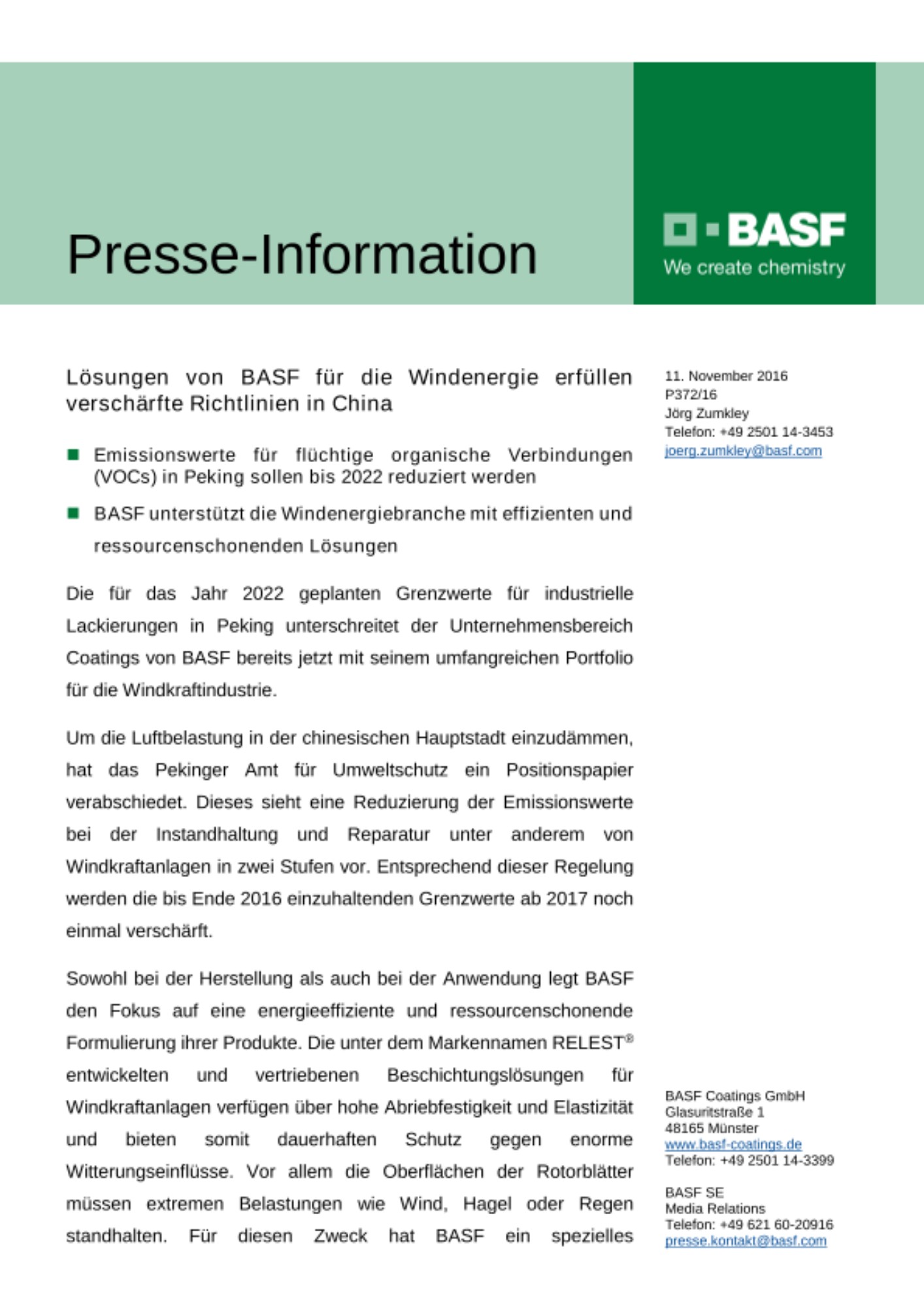 Die für das Jahr 2022 geplanten Grenzwerte für industrielle Lackierungen in Peking unterschreitet der Unternehmensbereich Coatings von BASF bereits jetzt mit seinem umfangreichen Portfolio für die Windkraftindustrie.