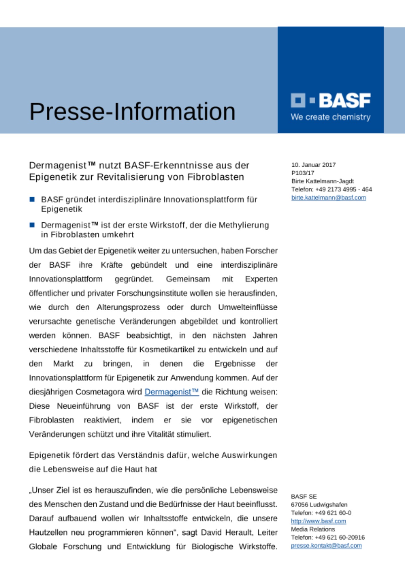 Um das Gebiet der Epigenetik weiter zu untersuchen, haben Forscher der BASF ihre Kräfte gebündelt und eine interdisziplinäre Innovationsplattform gegründet. Gemeinsam mit Experten öffentlicher und privater Forschungsinstitute wollen sie herausfinden, wie durch den Alterungsprozess oder durch Umwelteinflüsse verursachte genetische Veränderungen abgebildet und kontrolliert werden können. BASF beabsichtigt, in den nächsten Jahren verschiedene Inhaltsstoffe für Kosmetikartikel zu entwickeln und auf den Markt zu bringen, in denen die Ergebnisse der Innovationsplattform für Epigenetik zur Anwendung kommen. Auf der diesjährigen Cosmetagora wird Dermagenist™ die Richtung weisen: Diese Neueinführung von BASF ist der erste Wirkstoff, der Fibroblasten reaktiviert, indem er sie vor epigenetischen Veränderungen schützt und ihre Vitalität stimuliert.