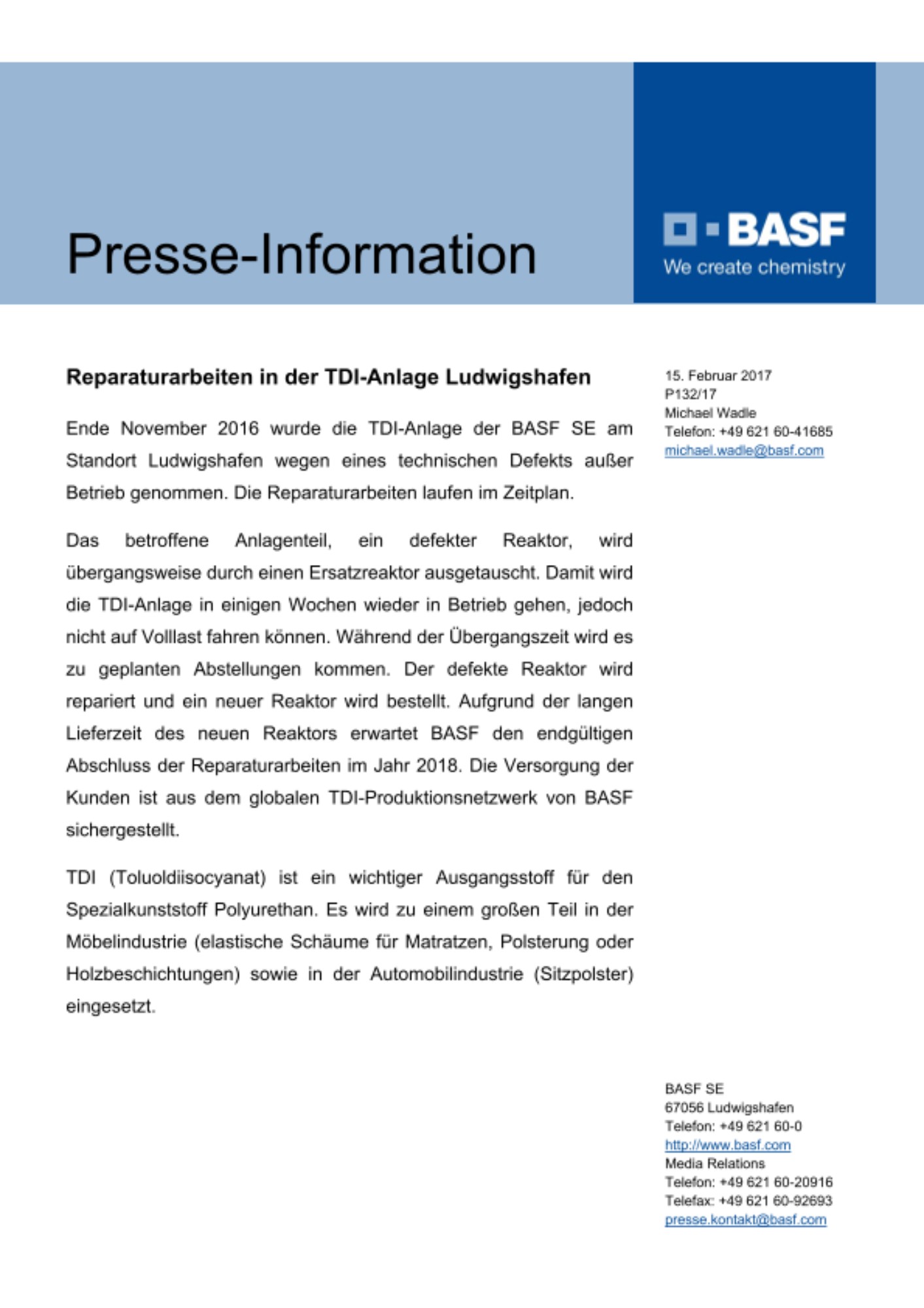 Ende November 2016 wurde die TDI-Anlage der BASF SE am Standort Ludwigshafen wegen eines technischen Defekts außer Betrieb genommen. Die Reparaturarbeiten laufen im Zeitplan.