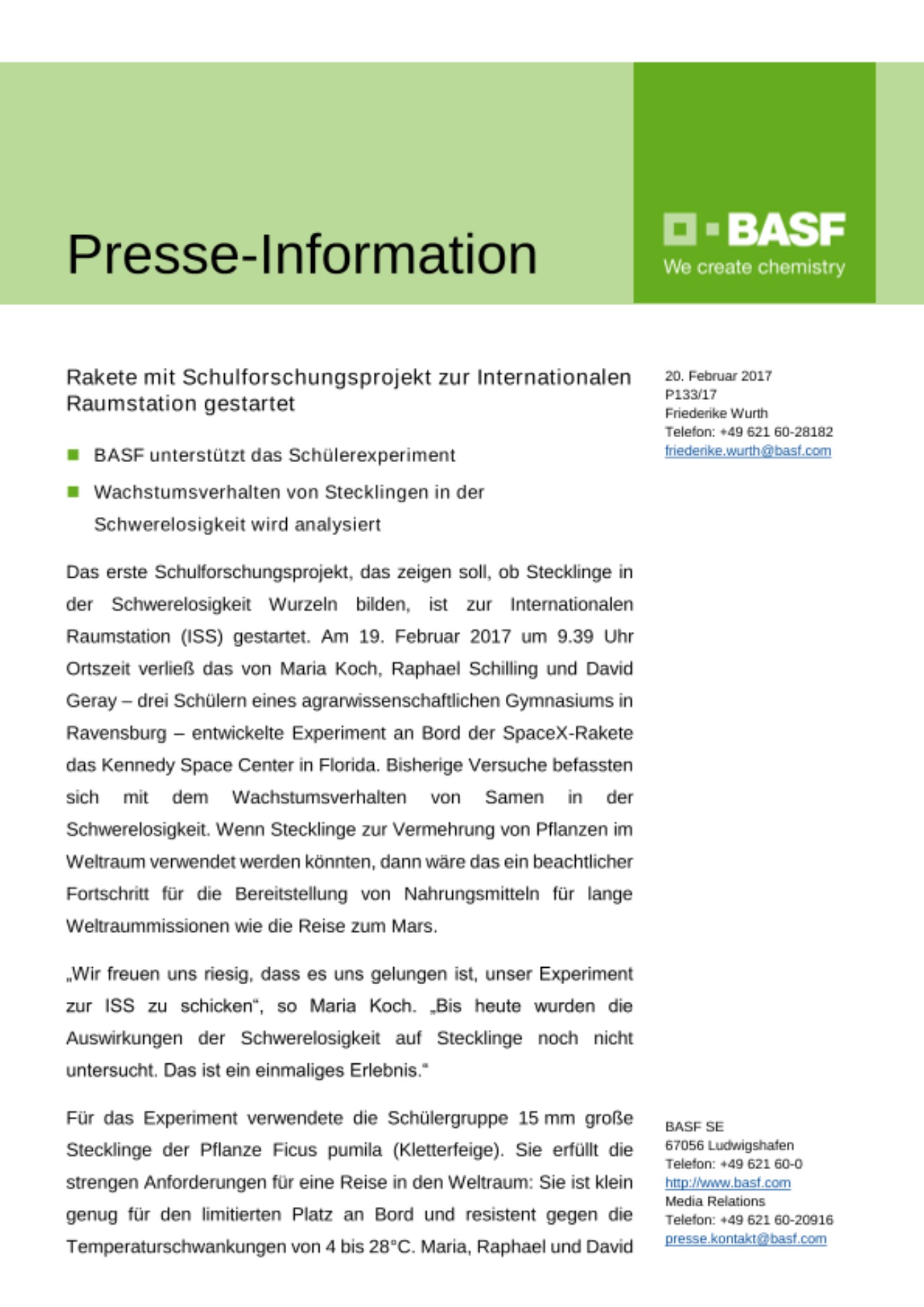 Die Pflanzenschutz-Experten der BASF haben die jungen Wissenschaftler mit Fachwissen, Material und Ausrüstung unterstützt und sie wissenschaftlich beraten. Für die Entwicklung des Experiments absolvierten die Schüler ein Praktikum am BASF-Agrarzentrum in Limburgerhof, Deutschland. Da die Stecklinge im Weltraum extremen Temperatur- und Feuchtigkeitsschwankungen ausgesetzt sein können, müssen sie vor Bakterien- und Pilzbefall geschützt werden. Um das zu gewährleisten lieferte die BASF sowohl Wissen als auch Produkte. Die Fungizide Xemium® und Initium® von BASF sorgen dafür, dass die Stecklinge auf ihrer Reise zur ISS und während der dortigen Forschungsarbeiten gesund bleiben.