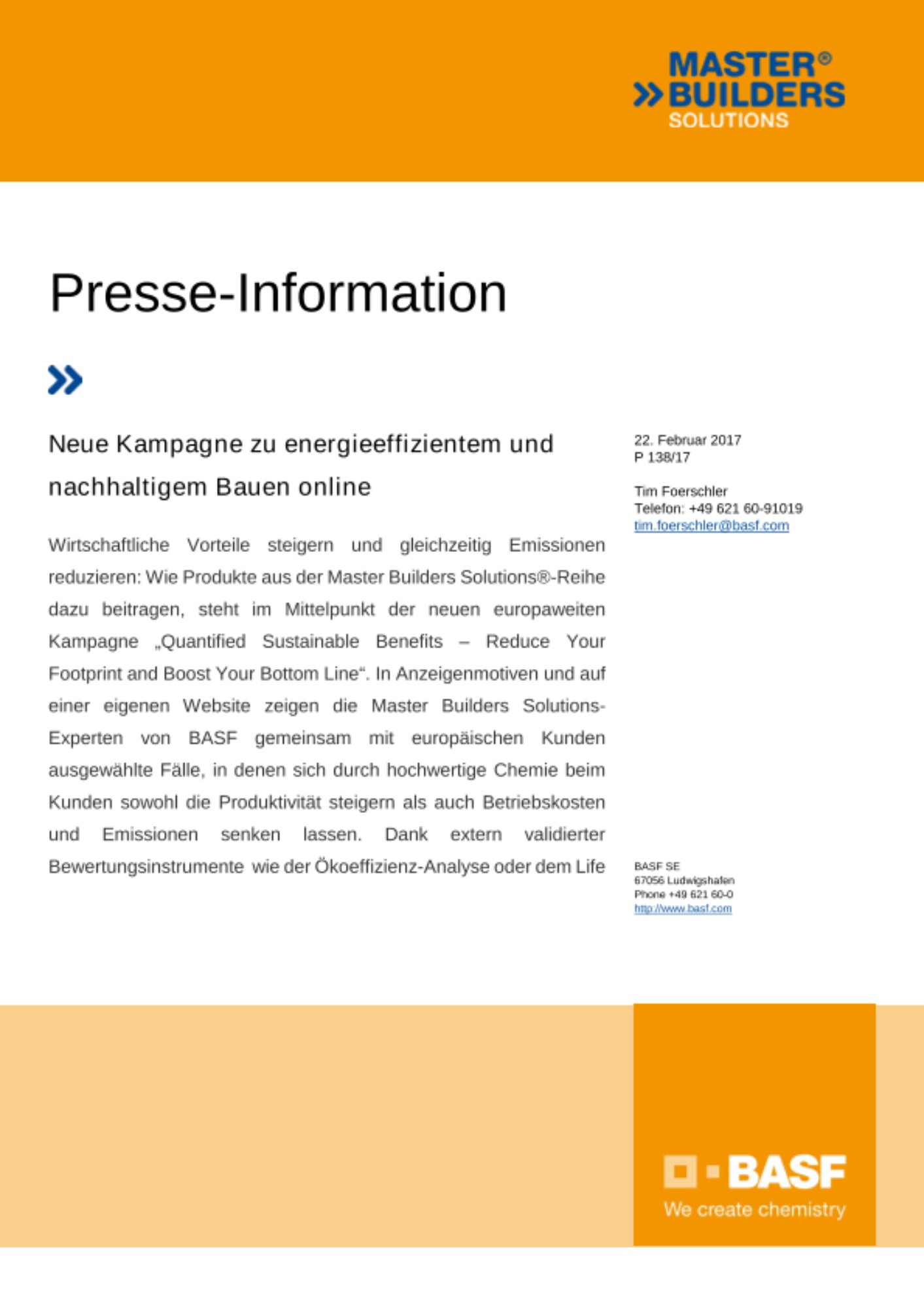 Wirtschaftliche Vorteile steigern und gleichzeitig Emissionen reduzieren: Wie Produkte aus der Master Builders Solutions®-Reihe dazu beitragen, steht im Mittelpunkt der neuen europaweiten Kampagne „Quantified Sustainable Benefits – Reduce Your Footprint and Boost Your Bottom Line“. In Anzeigenmotiven und auf einer eigenen Website zeigen die Master Builders Solutions-Experten von BASF gemeinsam mit europäischen Kunden ausgewählte Fälle, in denen sich durch hochwertige Chemie beim Kunden sowohl die Produktivität steigern als auch Betriebskosten und Emissionen senken lassen. Dank extern validierter Bewertungsinstrumente wie der Ökoeffizienz-Analyse oder dem Life Cycle Analyzer von BASF können die erreichten Erfolge quantifiziert werden.