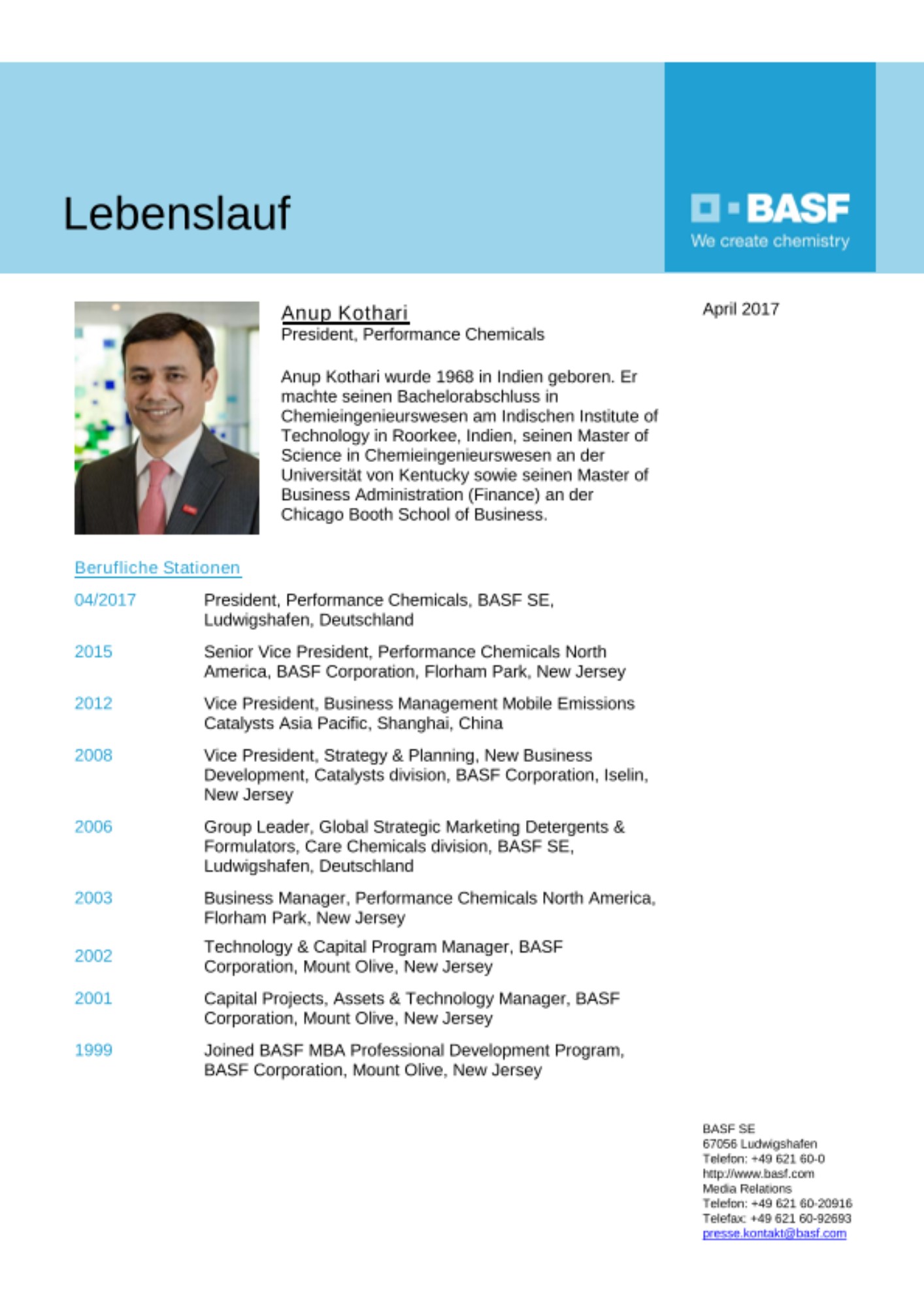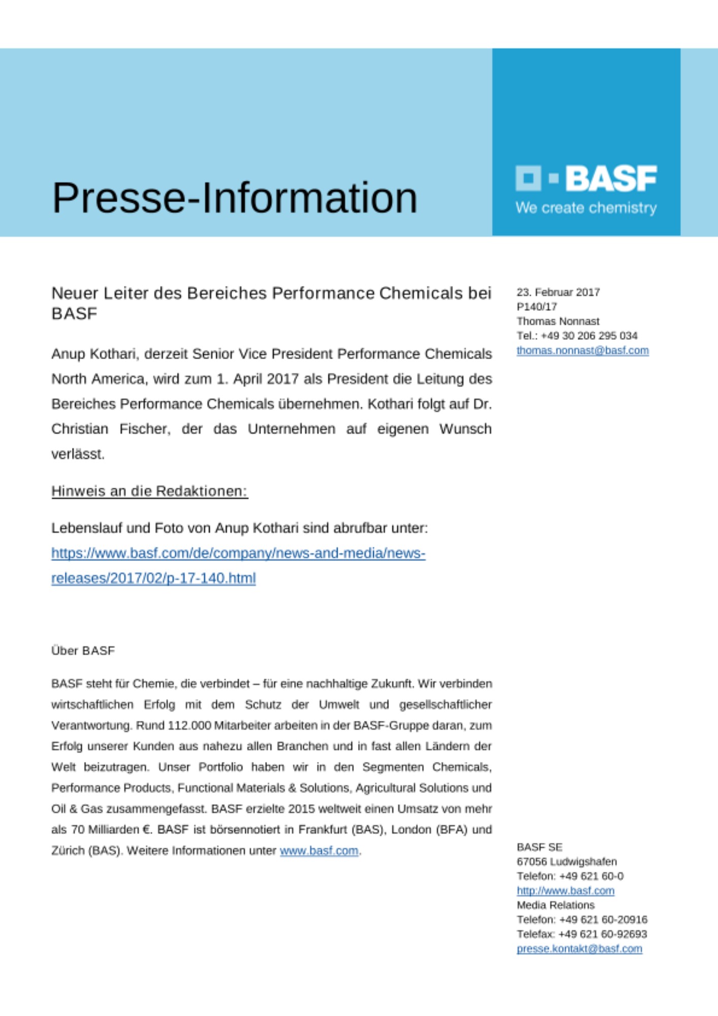 Anup Kothari, derzeit Senior Vice President Performance Chemicals North America, wird zum 1. April 2017 als President die Leitung des Bereiches Performance Chemicals übernehmen. Kothari folgt auf Dr. Christian Fischer, der das Unternehmen auf eigenen Wunsch verlässt.