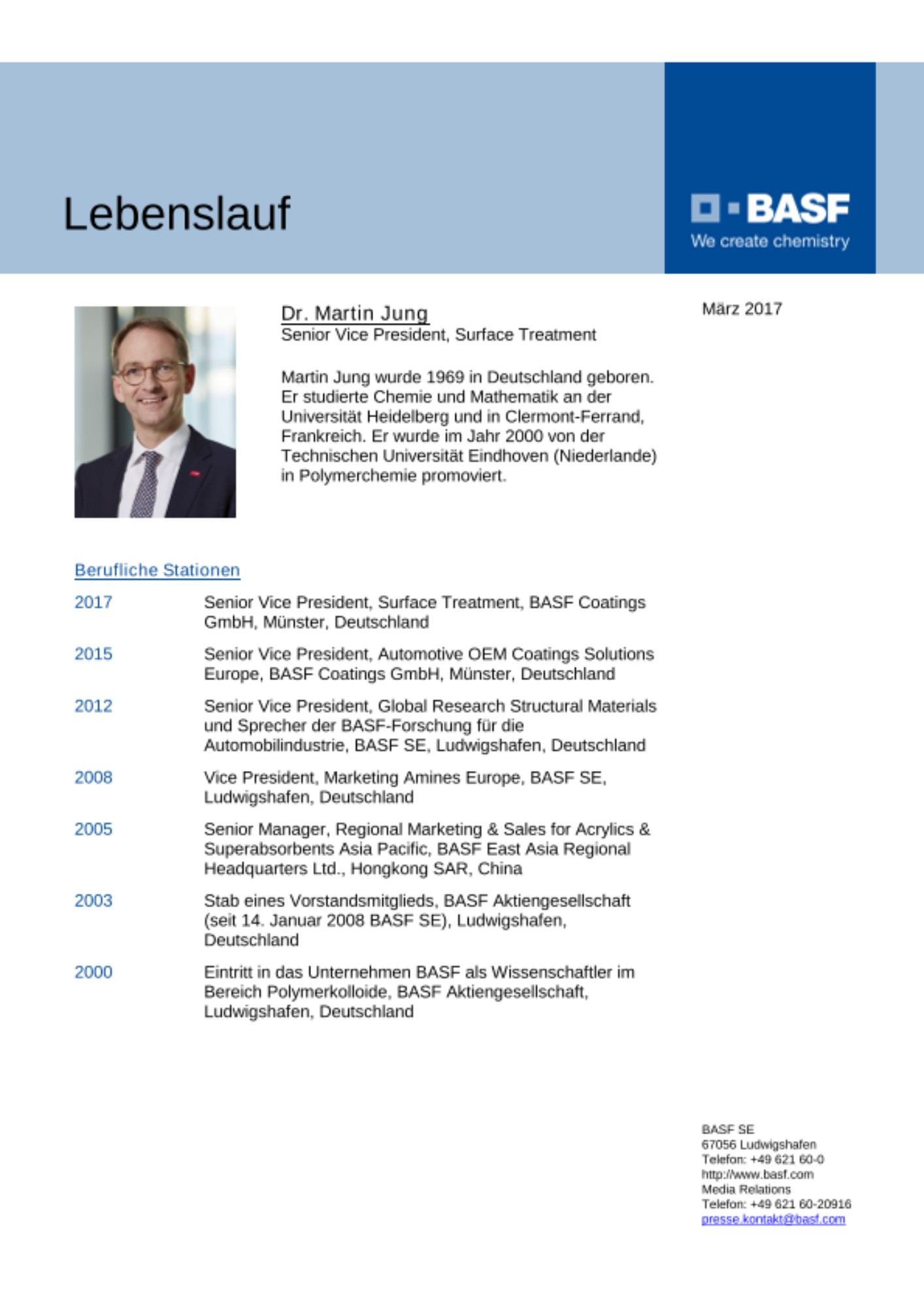 Vor Antritt seiner derzeitigen Funktion leitete Martin Jung im Unternehmensbereich Coatings der BASF den Geschäftsbereich Automotive OEM Coatings Solutions Europe. Er studierte Chemie und Mathematik an der Universität Heidelberg und im französischen Clermont-Ferrand. Jung promovierte an der Technischen Universität Eindhoven, Niederlande, in Polymerchemie. Er trat 2000 in die BASF ein und hatte im Konzern verschiedene Führungspositionen in Deutschland und im Ausland inne, darunter Senior Vice President von Global Research Structural Materials und Vice President von Marketing Amines Europe.