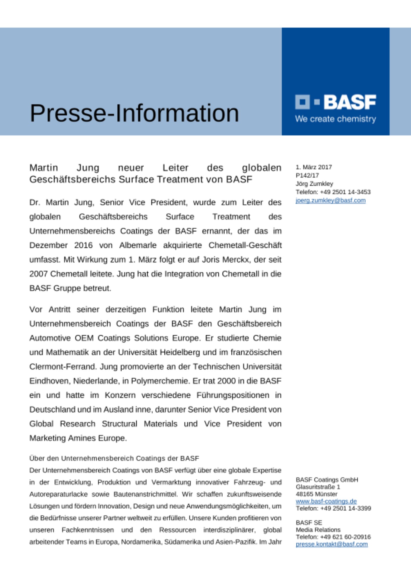 Dr. Martin Jung, Senior Vice President, wurde zum Leiter des globalen Geschäftsbereichs Surface Treatment des Unternehmensbereichs Coatings der BASF ernannt, der das im Dezember 2016 von Albemarle akquirierte Chemetall-Geschäft umfasst. Mit Wirkung zum 1. März folgt er auf Joris Merckx, der seit 2007 Chemetall leitete. Jung hat die Integration von Chemetall in die BASF Gruppe betreut.