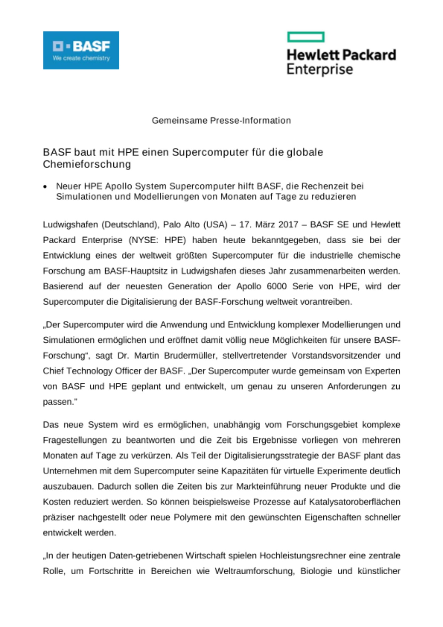 Ludwigshafen (Deutschland), Palo Alto (USA) – 17. März 2017 – BASF SE und Hewlett Packard Enterprise (NYSE: HPE) haben heute bekanntgegeben, dass sie bei der Entwicklung eines der weltweit größten Supercomputer für die industrielle chemische Forschung am BASF-Hauptsitz in Ludwigshafen dieses Jahr zusammenarbeiten werden. Basierend auf der neuesten Generation der Apollo 6000 Serie von HPE, wird der Supercomputer die Digitalisierung der BASF-Forschung weltweit vorantreiben.