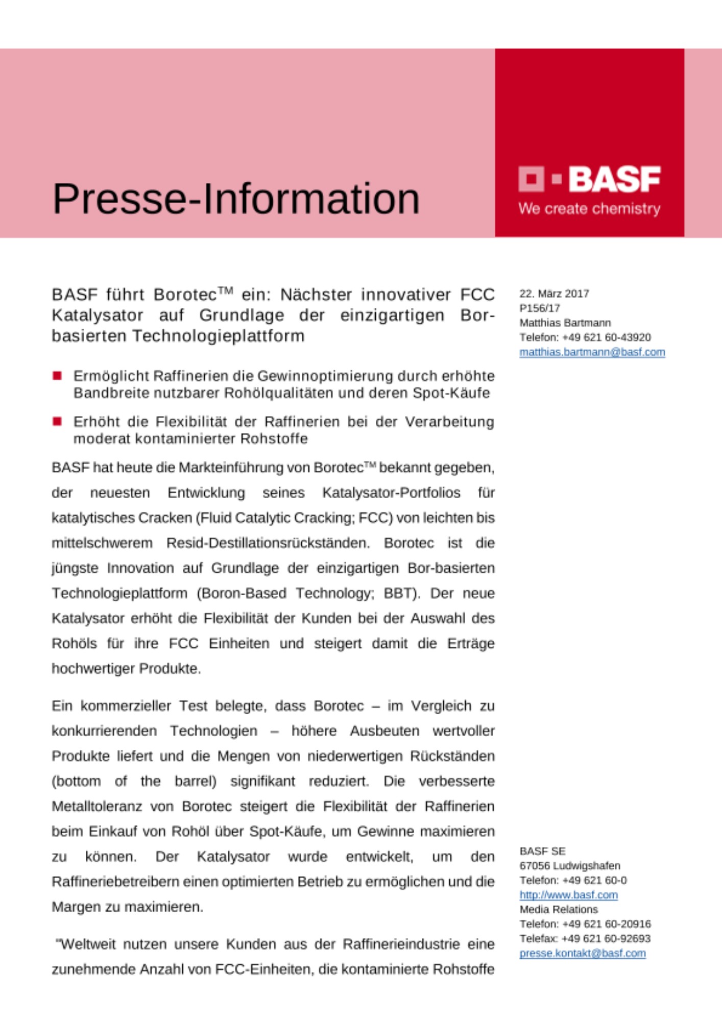 BASF hat heute die Markteinführung von BorotecTM bekannt gegeben, der neuesten Entwicklung seines Katalysator-Portfolios für katalytisches Cracken (Fluid Catalytic Cracking; FCC) von leichten bis mittelschwerem Resid-Destillationsrückständen. Borotec ist die jüngste Innovation auf Grundlage der einzigartigen Bor-basierten Technologieplattform (Boron-Based Technology; BBT). Der neue Katalysator erhöht die Flexibilität der Kunden bei der Auswahl des Rohöls für ihre FCC Einheiten und steigert damit die Erträge hochwertiger Produkte.