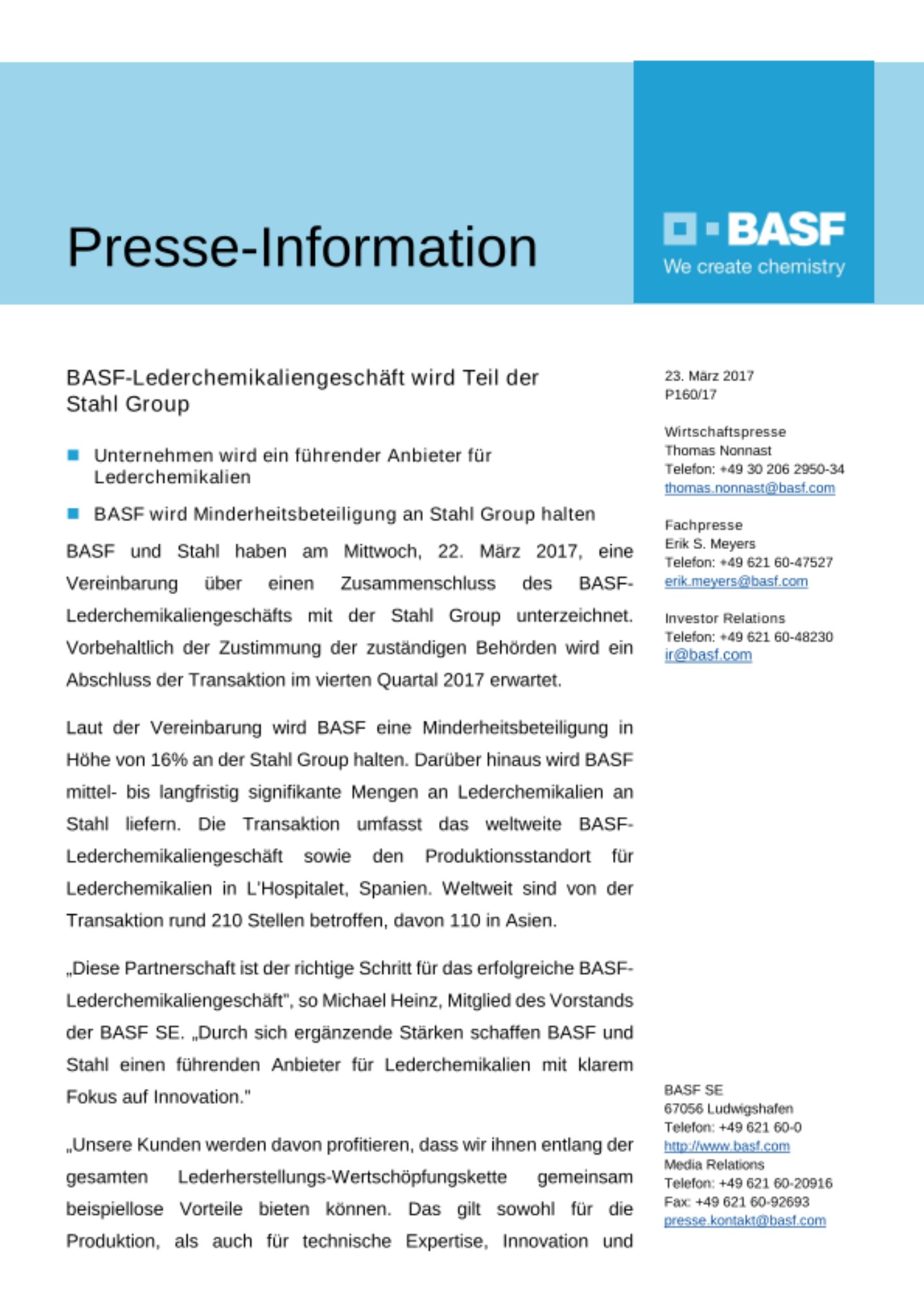 BASF und Stahl haben am Mittwoch, 22. März 2017, eine Vereinbarung über einen Zusammenschluss des BASF-Lederchemikaliengeschäfts mit der Stahl Group unterzeichnet. Vorbehaltlich der Zustimmung der zuständigen Behörden wird ein Abschluss der Transaktion im vierten Quartal 2017 erwartet.