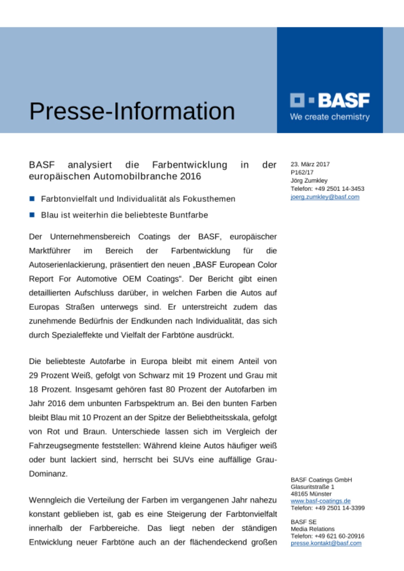 Mit der Analyse der Verteilung der Automobilfarben in Europa ergänzt der BASF European Color Report die Aussagen der jährlich erscheinenden Automotive Color Trends des Unternehmensbereichs Coatings der BASF. Während die Trendkollektion Farbkonzepte vorstellt, welche die automobile Zukunft prägen werden, befasst sich der Report mit der gegenwärtigen Marktsituation und bezieht sich dabei auf die Daten des vergangenen Jahres.