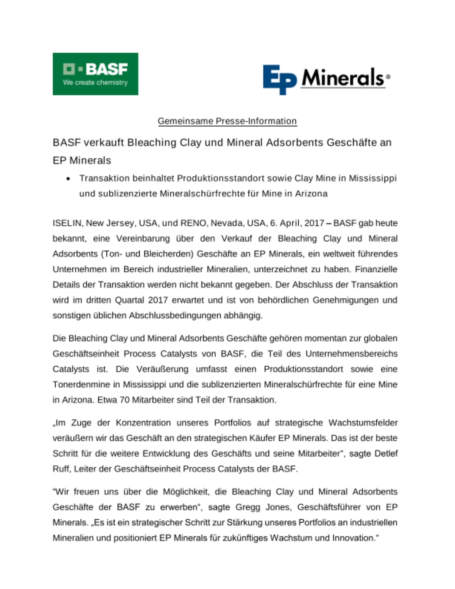 ISELIN, New Jersey, USA, und RENO, Nevada, USA, 6. April, 2017 – BASF gab heute bekannt, eine Vereinbarung über den Verkauf der Bleaching Clay und Mineral Adsorbents (Ton- und Bleicherden) Geschäfte an EP Minerals, ein weltweit führendes Unternehmen im Bereich industrieller Mineralien, unterzeichnet zu haben. Finanzielle Details der Transaktion werden nicht bekannt gegeben. Der Abschluss der Transaktion wird im dritten Quartal 2017 erwartet und ist von behördlichen Genehmigungen und sonstigen üblichen Abschlussbedingungen abhängig.