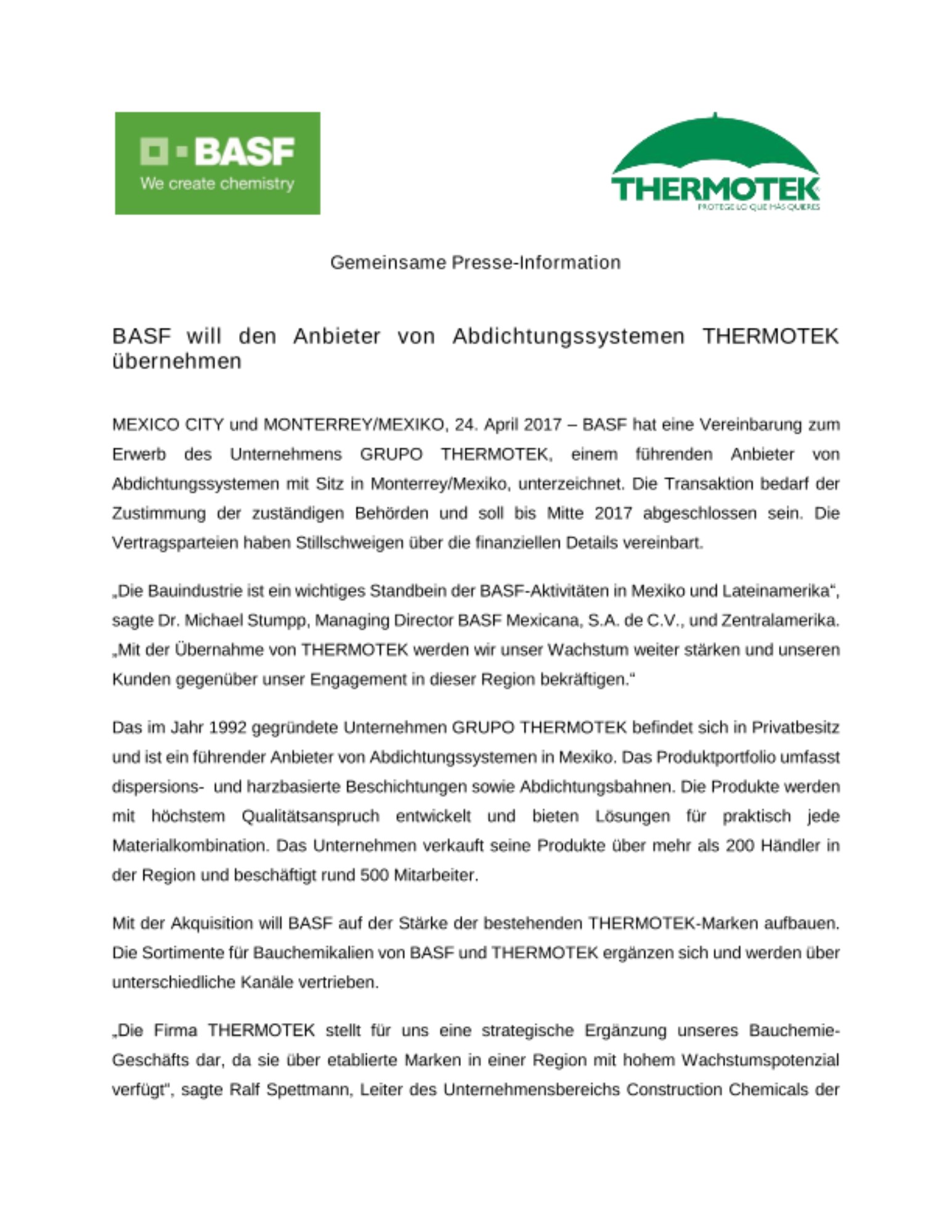MEXICO CITY und MONTERREY/MEXIKO, 24. April 2017 – BASF hat eine Vereinbarung zum Erwerb des Unternehmens GRUPO THERMOTEK, einem führenden Anbieter von Abdichtungssystemen mit Sitz in Monterrey/Mexiko, unterzeichnet. Die Transaktion bedarf der Zustimmung der zuständigen Behörden und soll bis Mitte 2017 abgeschlossen sein. Die Vertragsparteien haben Stillschweigen über die finanziellen Details vereinbart.