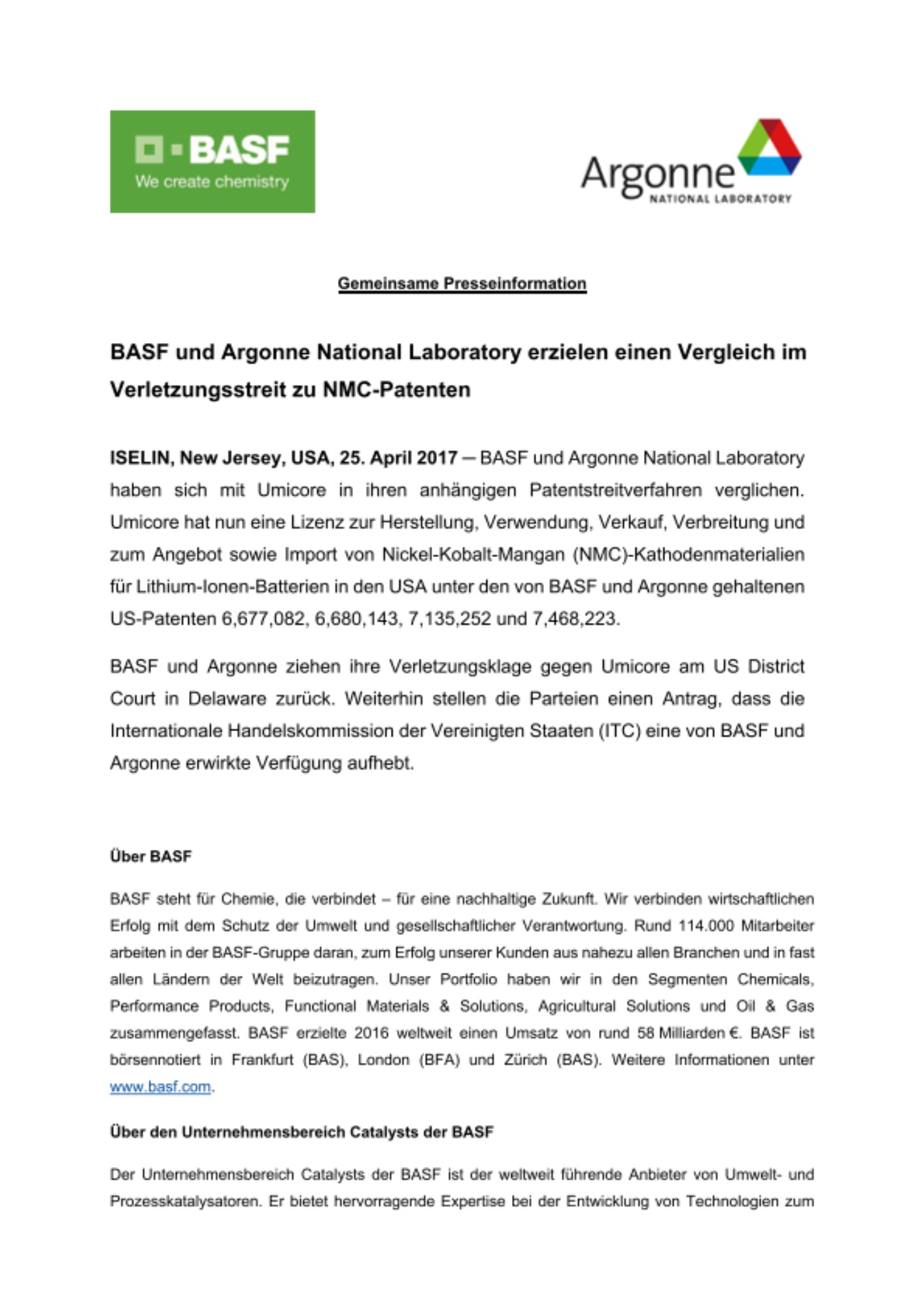 ISELIN, New Jersey, USA, 25. April 2017 ─ BASF und Argonne National Laboratory haben sich mit Umicore in ihren anhängigen Patentstreitverfahren verglichen. Umicore hat nun eine Lizenz zur Herstellung, Verwendung, Verkauf, Verbreitung und zum Angebot sowie Import von Nickel-Kobalt-Mangan (NMC)-Kathodenmaterialien für Lithium-Ionen-Batterien in den USA unter den von BASF und Argonne gehaltenen US-Patenten 6,677,082, 6,680,143, 7,135,252 und 7,468,223.
