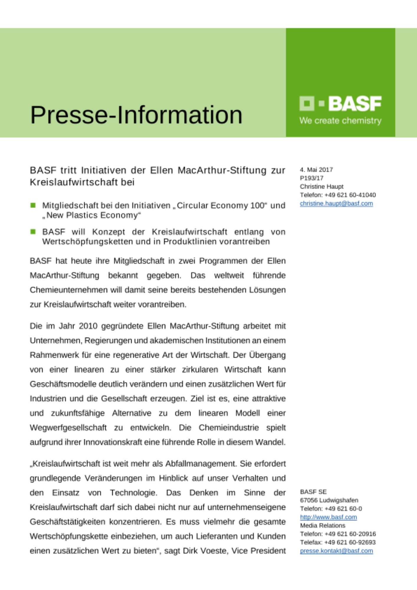 BASF wird auch Mitglied der Stiftungsinitiative „New Plastics Economy“. Diese bringt wichtige Interessensvertreter zusammen, die zunächst am Beispiel Verpackung die Zukunft von Kunststoff neu denken und gestalten. BASF wird hier eng mit den Teilnehmern der Initiative zusammenarbeiten, um den Wandel hin zu einer Kreislaufwirtschaft für Kunststoff zu beschleunigen, und dabei sicherzustellen, dass Vorteile wie Schutz von Lebensmitteln durch Kunststoffverpackungen fortbestehen.