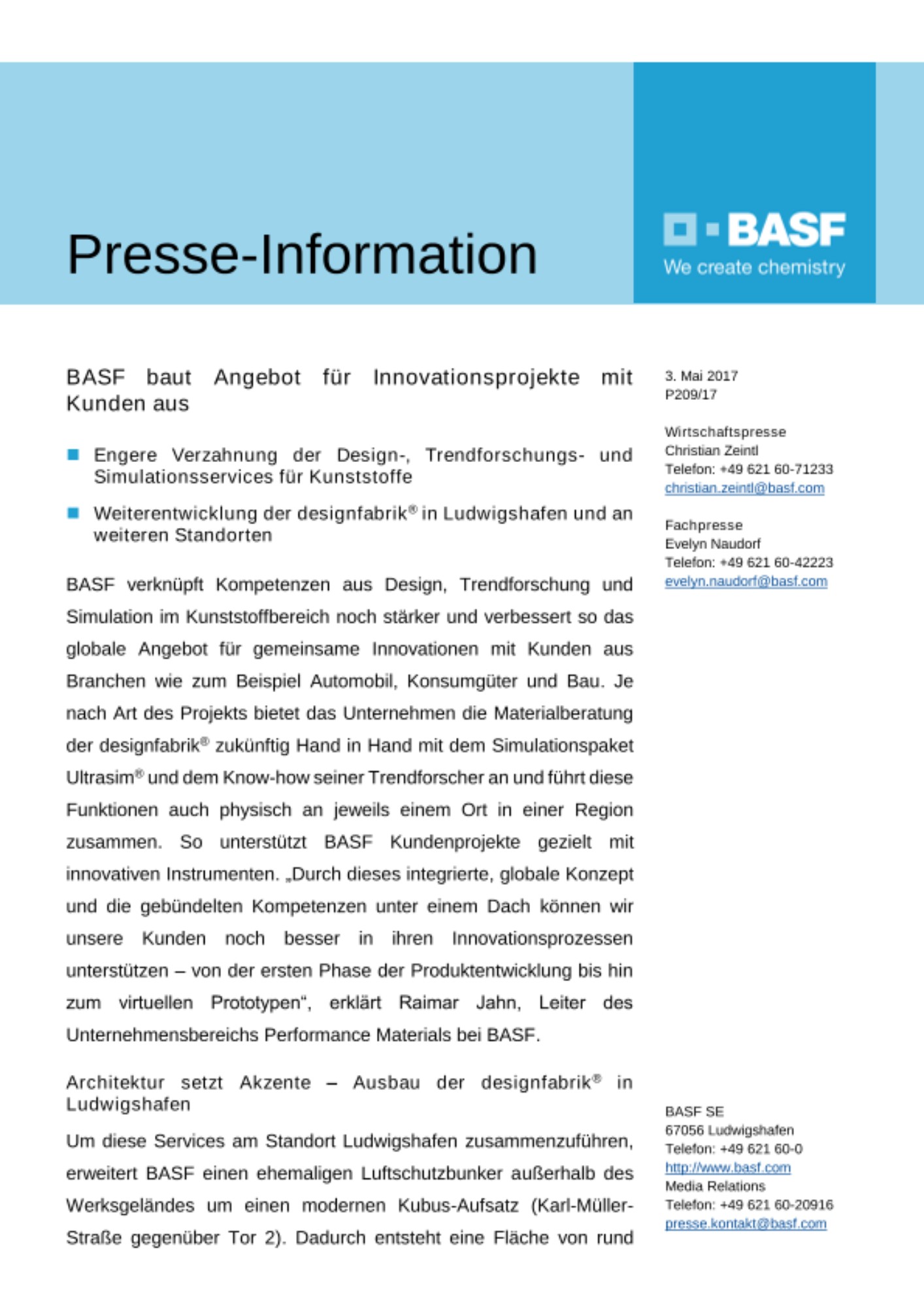 Der Bereich Performance Materials der BASF bündelt das gesamte werkstoffliche Know-how der BASF für innovative, maßgeschneiderte Kunststoffe unter einem Dach. Der Bereich, der in vier großen Branchen – Transportwesen, Bauwirtschaft, industrielle Anwendungen und Konsumgüter – aktiv ist, verfügt über ein breites Portfolio von Produkten und Services sowie ein tiefes Verständnis für anwendungsorientierte Systemlösungen. Wesentliche Treiber für Profitabilität und Wachstum sind unsere enge Zusammenarbeit mit den Kunden und ein klarer Fokus auf Lösungen. Starke F&E-Kompetenzen bilden die Basis für die Entwicklung innovativer Produkte und Anwendungen. 2016 betrug der weltweite Umsatz des Bereichs Performance Materials 6,9 Milliarden €. Mehr Informationen im Internet unter: www.performance-materials.basf.com.