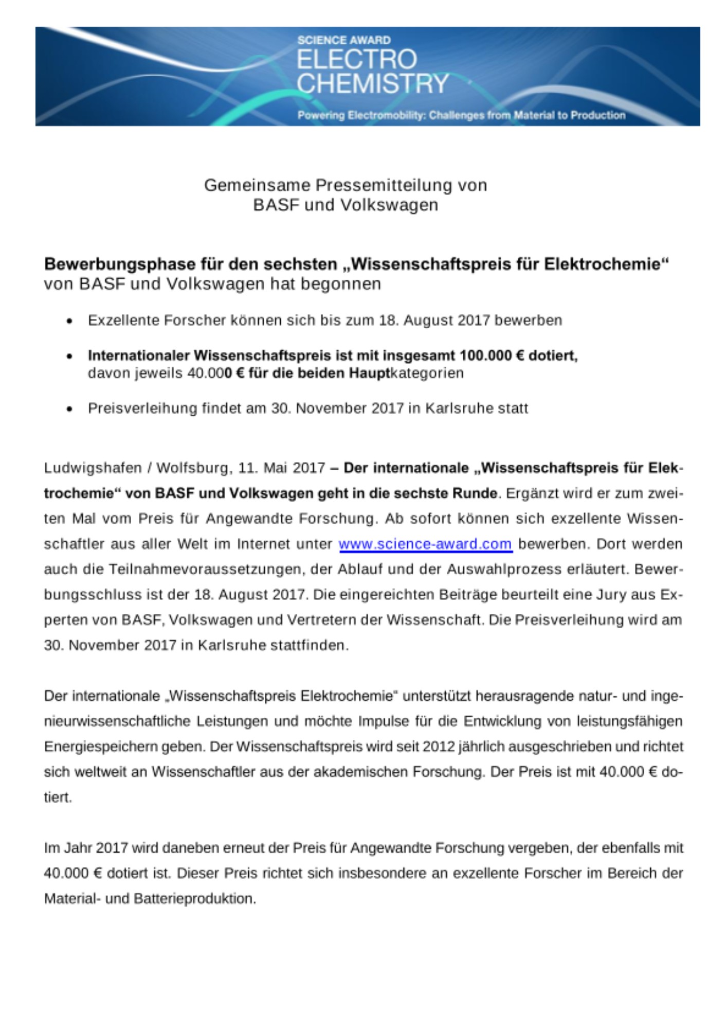 Ludwigshafen / Wolfsburg, 11. Mai 2017 – Der internationale „Wissenschaftspreis für Elek-trochemie“ von BASF und Volkswagen geht in die sechste Runde. Ergänzt wird er zum zweiten Mal vom Preis für Angewandte Forschung. Ab sofort können sich exzellente Wissenschaftler aus aller Welt im Internet unter www.science-award.com bewerben. Dort werden auch die Teilnahmevoraussetzungen, der Ablauf und der Auswahlprozess erläutert. Bewerbungsschluss ist der 18. August 2017. Die eingereichten Beiträge beurteilt eine Jury aus Experten von BASF, Volkswagen und Vertretern der Wissenschaft. Die Preisverleihung wird am 30. November 2017 in Karlsruhe stattfinden.