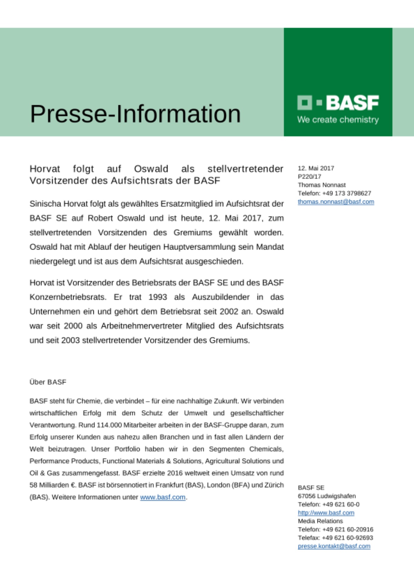 Sinischa Horvat folgt als gewähltes Ersatzmitglied im Aufsichtsrat der BASF SE auf Robert Oswald und ist heute, 12. Mai 2017, zum stellvertretenden Vorsitzenden des Gremiums gewählt worden. Oswald hat mit Ablauf der heutigen Hauptversammlung sein Mandat niedergelegt und ist aus dem Aufsichtsrat ausgeschieden.