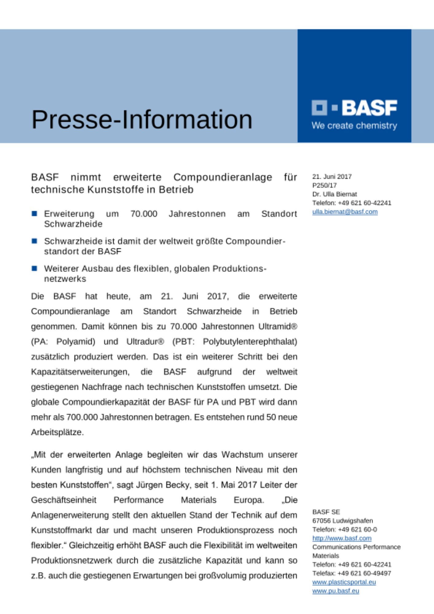 „Mit der erweiterten Anlage begleiten wir das Wachstum unserer Kunden langfristig und auf höchstem technischen Niveau mit den besten Kunststoffen“, sagt Jürgen Becky, seit 1. Mai 2017 Leiter der Geschäftseinheit Performance Materials Europa. „Die Anlagenerweiterung stellt den aktuellen Stand der Technik auf dem Kunststoffmarkt dar und macht unseren Produktionsprozess noch flexibler.“ Gleichzeitig erhöht BASF auch die Flexibilität im weltweiten Produktionsnetzwerk durch die zusätzliche Kapazität und kann so z.B. auch die gestiegenen Erwartungen bei großvolumig produzierten Bauteilen in der Automobilindustrie besser erfüllen. Mit der Erweiterung ist Schwarzheide der Standort mit der weltweit größten Compoundierkapazität der BASF für PA und PBT.
