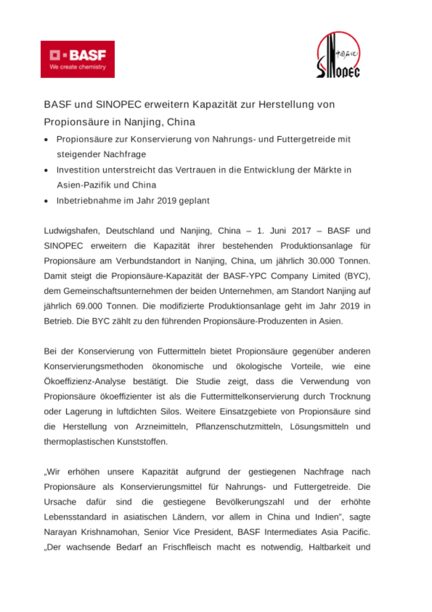 Ludwigshafen, Deutschland und Nanjing, China – 1. Juni 2017 – BASF und SINOPEC erweitern die Kapazität ihrer bestehenden Produktionsanlage für Propionsäure am Verbundstandort in Nanjing, China, um jährlich 30.000 Tonnen. Damit steigt die Propionsäure-Kapazität der BASF-YPC Company Limited (BYC), dem Gemeinschaftsunternehmen der beiden Unternehmen, am Standort Nanjing auf jährlich 69.000 Tonnen. Die modifizierte Produktionsanlage geht im Jahr 2019 in Betrieb. Die BYC zählt zu den führenden Propionsäure-Produzenten in Asien.