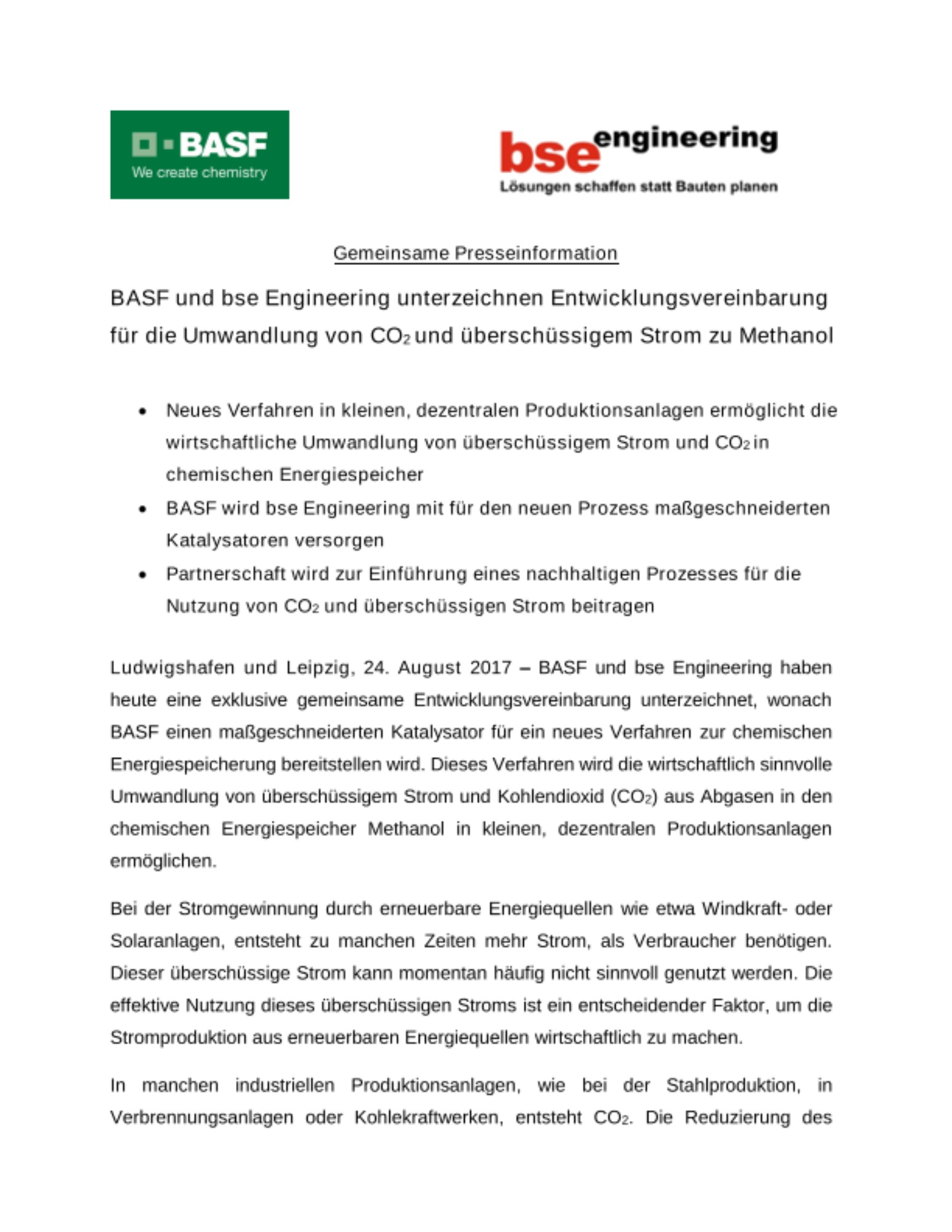Ludwigshafen und Leipzig, 24. August 2017 – BASF und bse Engineering haben heute eine exklusive gemeinsame Entwicklungsvereinbarung unterzeichnet, wonach BASF einen maßgeschneiderten Katalysator für ein neues Verfahren zur chemischen Energiespeicherung bereitstellen wird. Dieses Verfahren wird die wirtschaftlich sinnvolle Umwandlung von überschüssigem Strom und Kohlendioxid (CO2) aus Abgasen in den chemischen Energiespeicher Methanol in kleinen, dezentralen Produktionsanlagen ermöglichen.