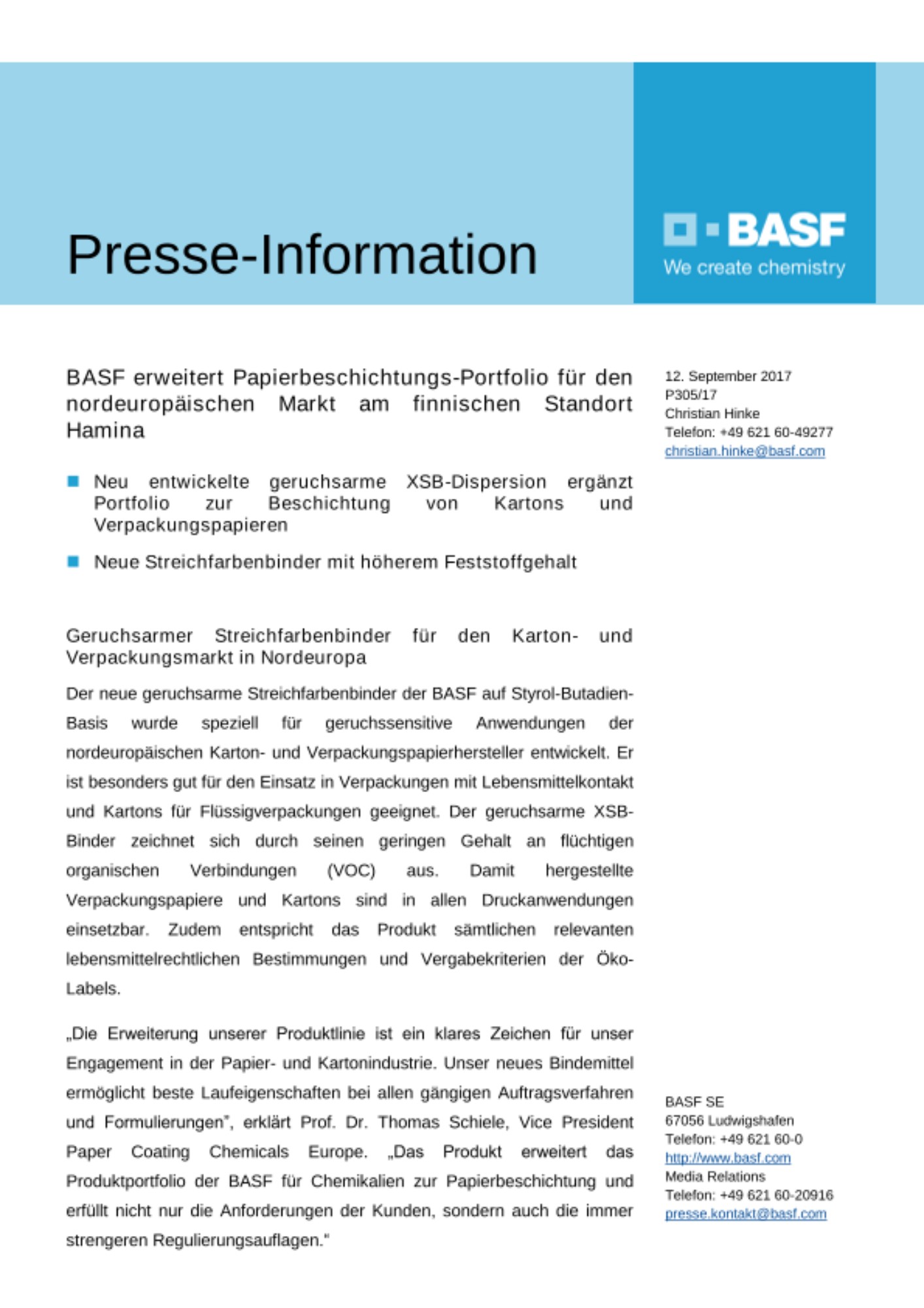 „Die Erweiterung unserer Produktlinie ist ein klares Zeichen für unser Engagement in der Papier- und Kartonindustrie. Unser neues Bindemittel ermöglicht beste Laufeigenschaften bei allen gängigen Auftragsverfahren und Formulierungen”, erklärt Prof. Dr. Thomas Schiele, Vice President Paper Coating Chemicals Europe. „Das Produkt erweitert das Produktportfolio der BASF für Chemikalien zur Papierbeschichtung und erfüllt nicht nur die Anforderungen der Kunden, sondern auch die immer strengeren Regulierungsauflagen.“