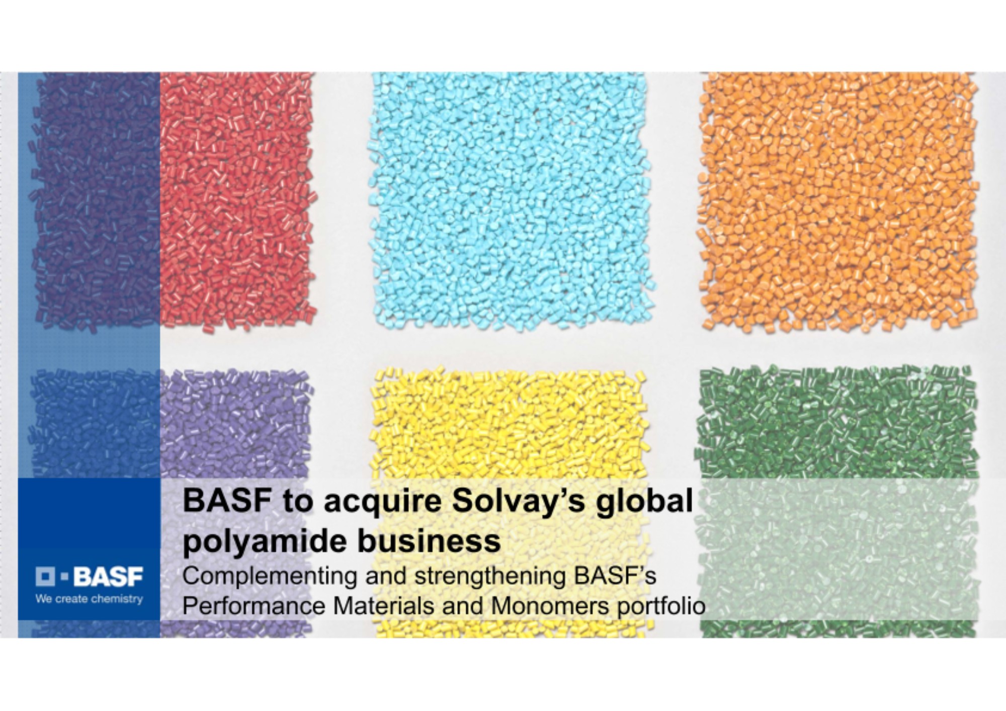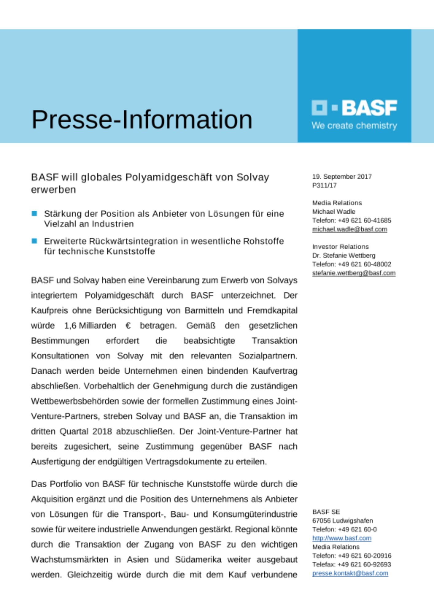BASF und Solvay haben eine Vereinbarung zum Erwerb von Solvays integriertem Polyamidgeschäft durch BASF unterzeichnet. Der Kaufpreis ohne Berücksichtigung von Barmitteln und Fremdkapital würde 1,6 Milliarden € betragen. Gemäß den gesetzlichen Bestimmungen erfordert die beabsichtigte Transaktion Konsultationen von Solvay mit den relevanten Sozialpartnern. Danach werden beide Unternehmen einen bindenden Kaufvertrag abschließen. Vorbehaltlich der Genehmigung durch die zuständigen Wettbewerbsbehörden sowie der formellen Zustimmung eines Joint-Venture-Partners, streben Solvay und BASF an, die Transaktion im dritten Quartal 2018 abzuschließen. Der Joint-Venture-Partner hat bereits zugesichert, seine Zustimmung gegenüber BASF nach Ausfertigung der endgültigen Vertragsdokumente zu erteilen.