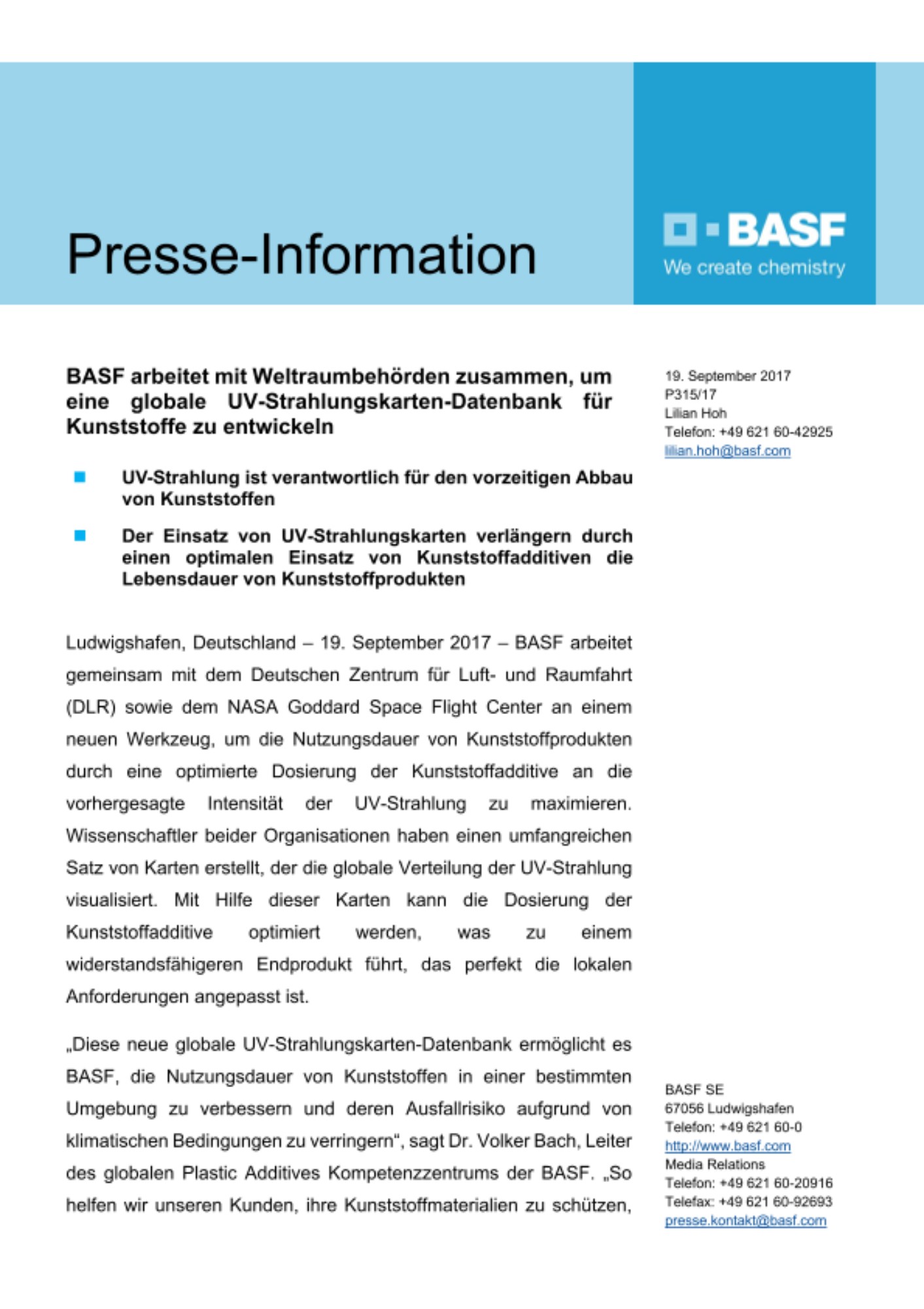 BASF arbeitet gemeinsam mit dem Deutschen Zentrum für Luft- und Raumfahrt (DLR) sowie dem NASA Goddard Space Flight Center an einem neuen Werkzeug, um die Nutzungsdauer von Kunststoffprodukten durch eine optimierte Dosierung der Kunststoffadditive an die vorhergesagte Intensität der UV-Strahlung zu maximieren. Wissenschaftler beider Organisationen haben einen umfangreichen Satz von Karten erstellt, der die globale Verteilung der UV-Strahlung visualisiert. Mit Hilfe dieser Karten kann die Dosierung der Kunststoffadditive optimiert werden, was zu einem widerstandsfähigeren Endprodukt führt, das perfekt die lokalen Anforderungen angepasst ist.