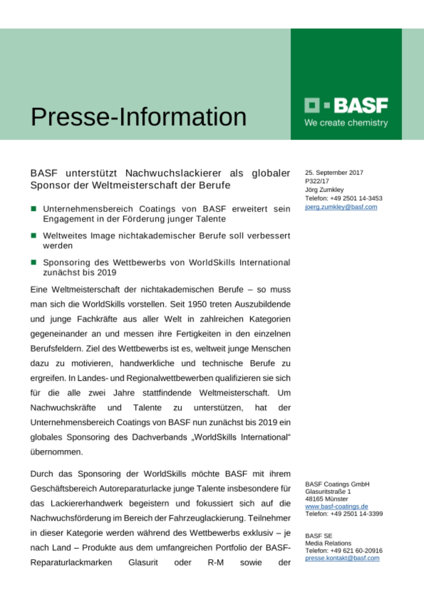Mit der Unterstützung durch den Unternehmensbereich Coatings von BASF steht WorldSkills ein starker globaler Partner zur Seite, der seine umfassende Expertise im Bereich der Autoreparaturlackierung in die Meisterschaften einbringen wird. Vom Sponsoring profitieren einerseits die Meisterschaften an sich, andererseits wird weltweit das Image zahlreicher Berufsfelder aufgewertet – und nicht zuletzt erhalten Nachwuchskräfte auf der ganzen Welt die Möglichkeit, sich in ihrem Beruf zu beweisen und neue Herausforderungen zu meistern.