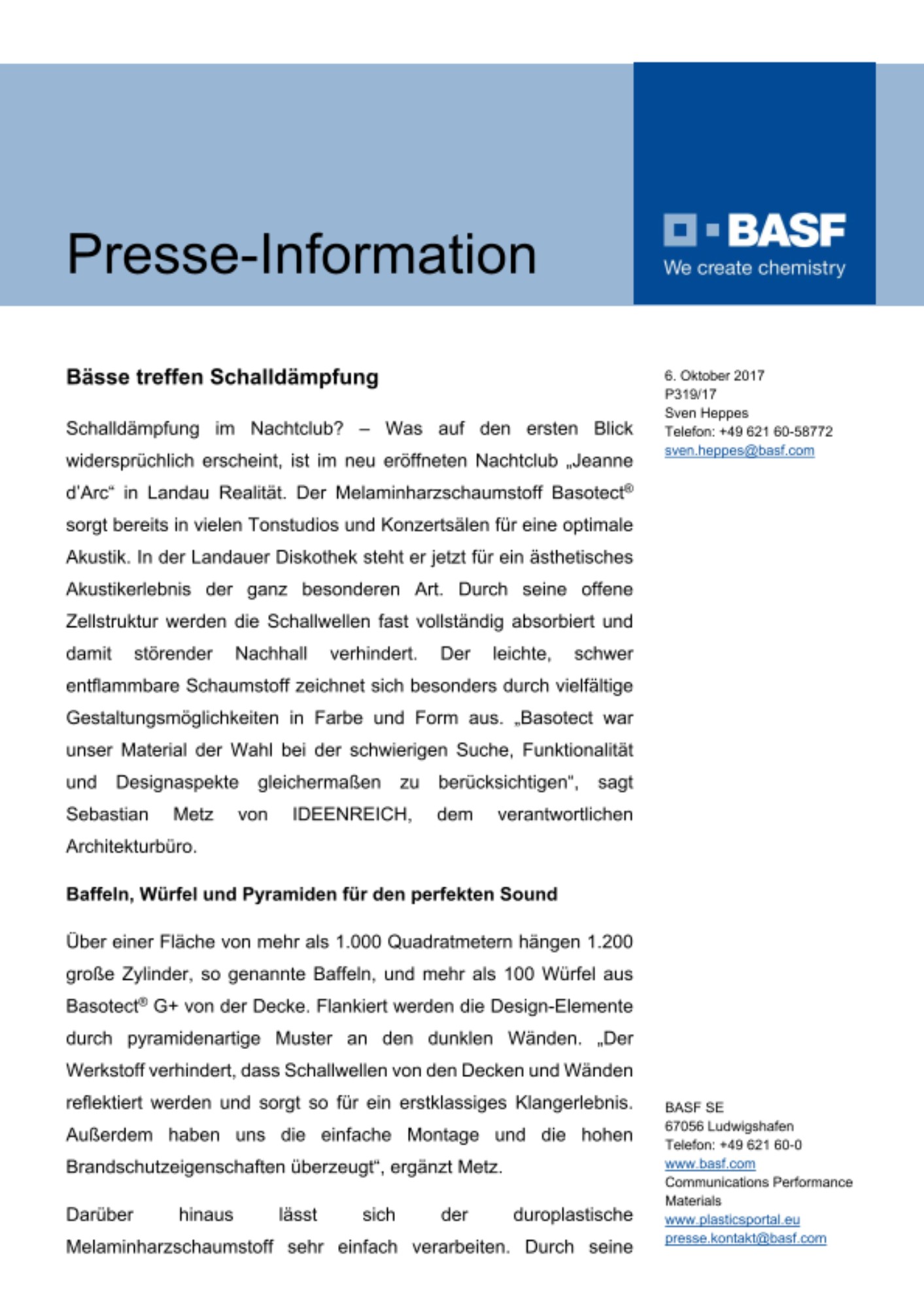 Schalldämpfung im Nachtclub? – Was auf den ersten Blick widersprüchlich erscheint, ist im neu eröffneten Nachtclub „Jeanne d’Arc“ in Landau Realität. Der Melaminharzschaumstoff Basotect® sorgt bereits in vielen Tonstudios und Konzertsälen für eine optimale Akustik. In der Landauer Diskothek steht er jetzt für ein ästhetisches Akustikerlebnis der ganz besonderen Art. Durch seine offene Zellstruktur werden die Schallwellen fast vollständig absorbiert und damit störender Nachhall verhindert. Der leichte, schwer entflammbare Schaumstoff zeichnet sich besonders durch vielfältige Gestaltungsmöglichkeiten in Farbe und Form aus. „Basotect war unser Material der Wahl bei der schwierigen Suche, Funktionalität und Designaspekte gleichermaßen zu berücksichtigen“, sagt Sebastian Metz von IDEENREICH, dem verantwortlichen Architekturbüro.