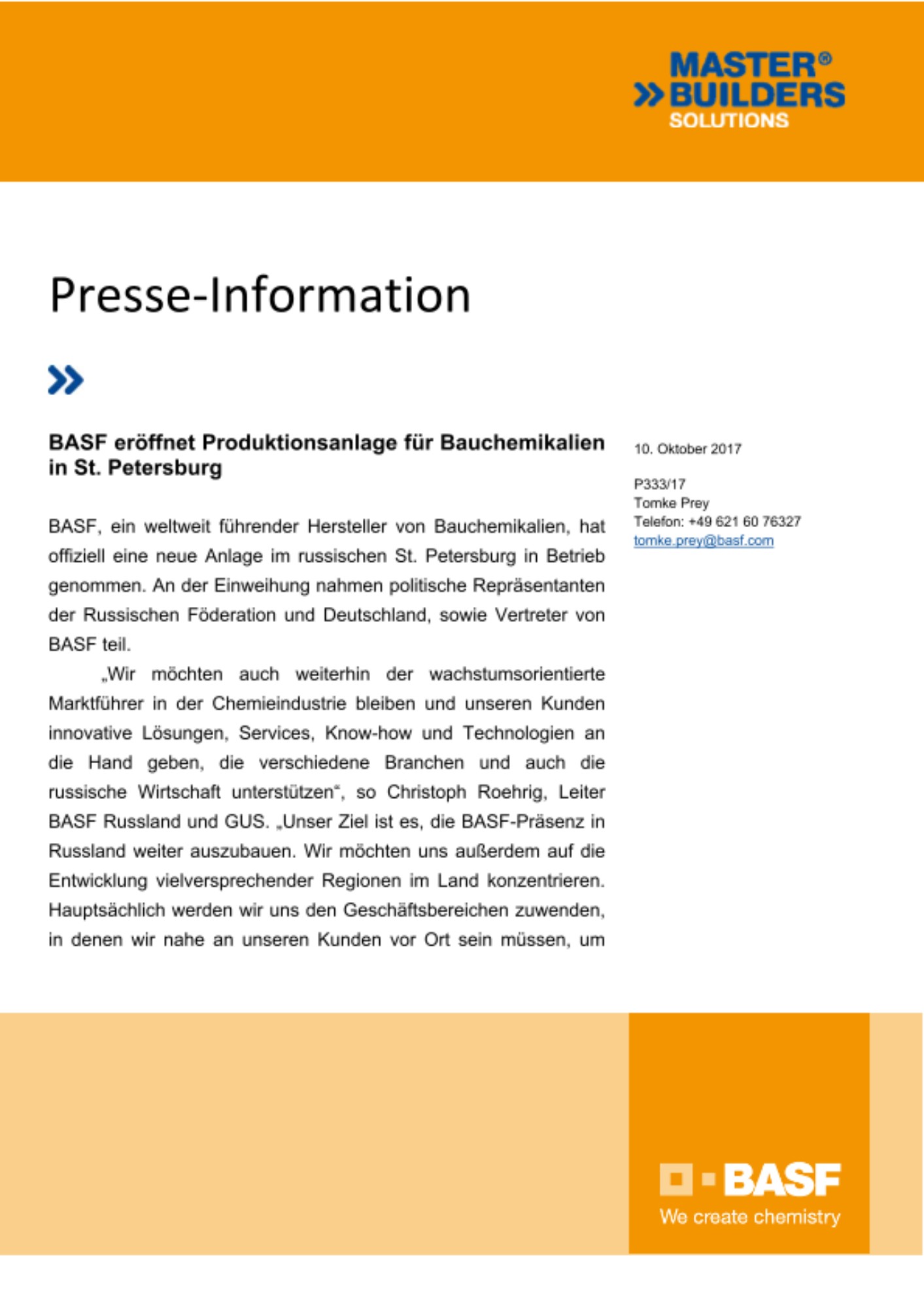 BASF eröffnet Produktionsanlage für Bauchemikalien in St. Petersburg