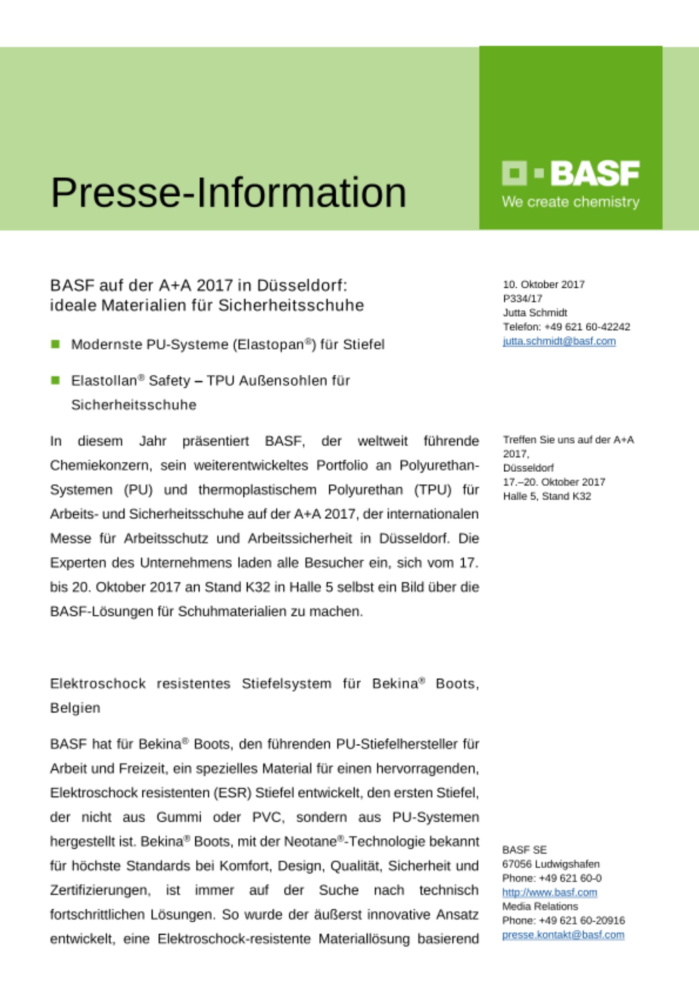 In diesem Jahr präsentiert BASF, der weltweit führende Chemiekonzern, sein weiterentwickeltes Portfolio an Polyurethan-Systemen (PU) und thermoplastischem Polyurethan (TPU) für Arbeits- und Sicherheitsschuhe auf der A+A 2017, der internationalen Messe für Arbeitsschutz und Arbeitssicherheit in Düsseldorf. Die Experten des Unternehmens laden alle Besucher ein, sich vom 17. bis 20. Oktober 2017 an Stand K32 in Halle 5 selbst ein Bild über die BASF-Lösungen für Schuhmaterialien zu machen.