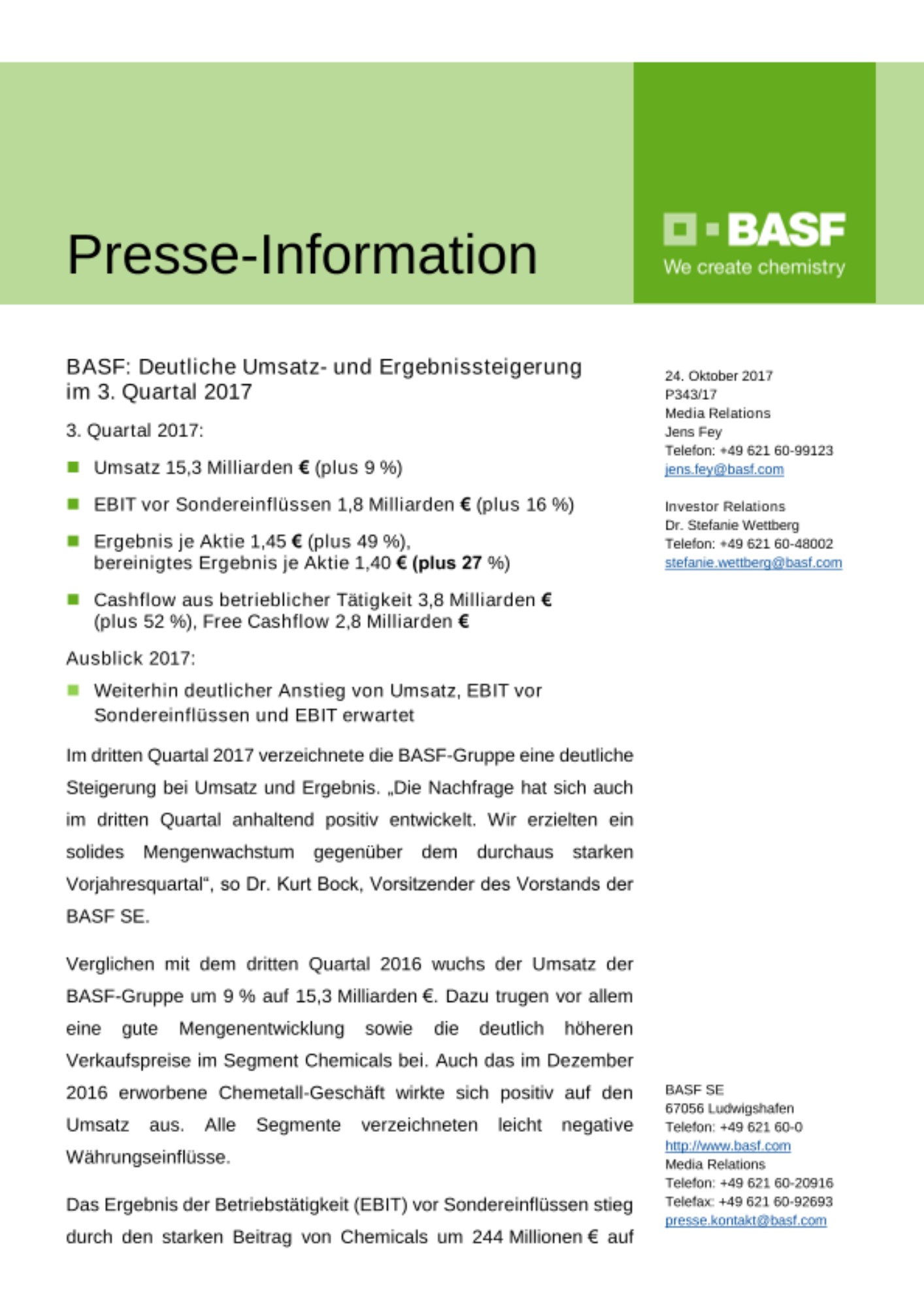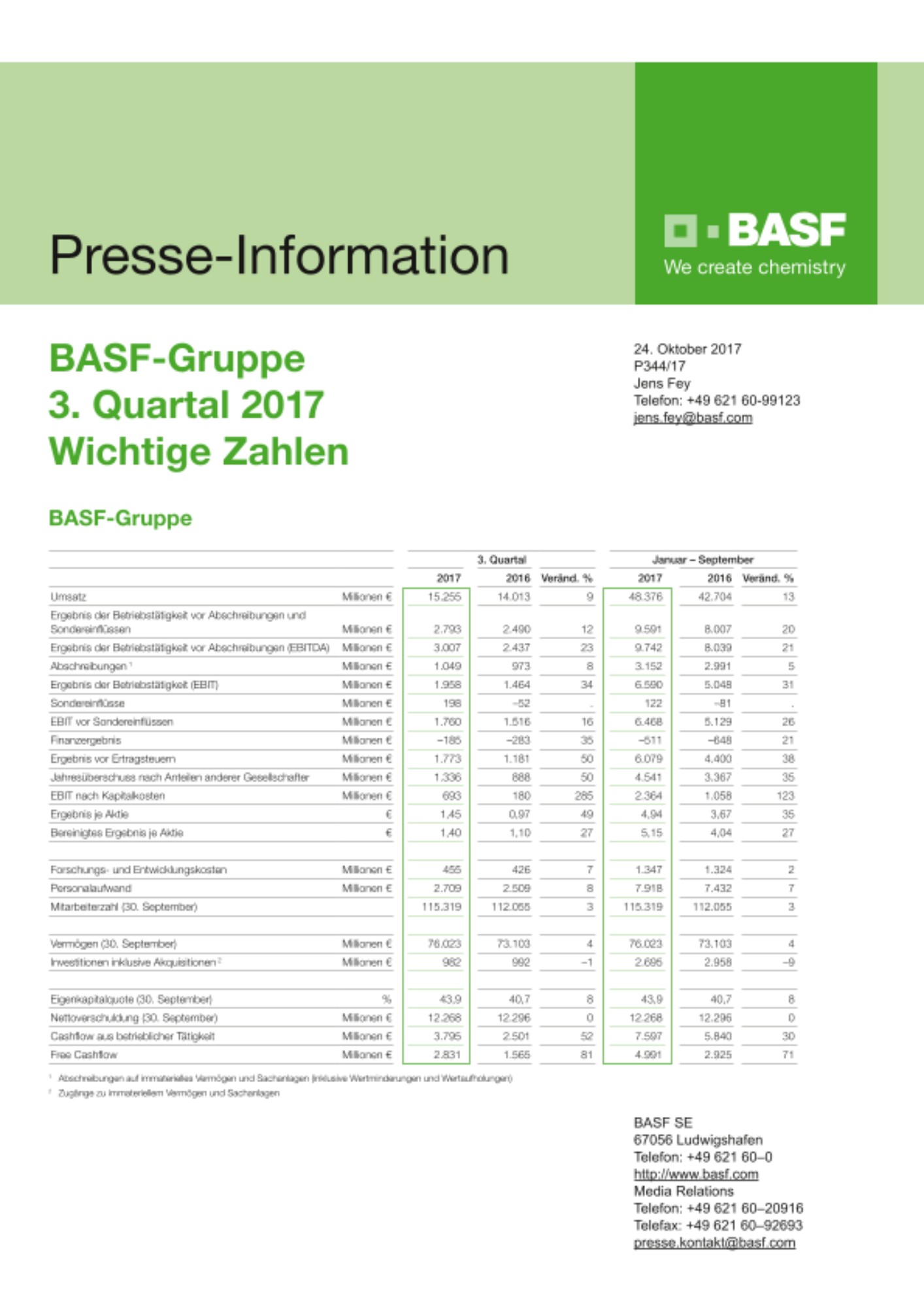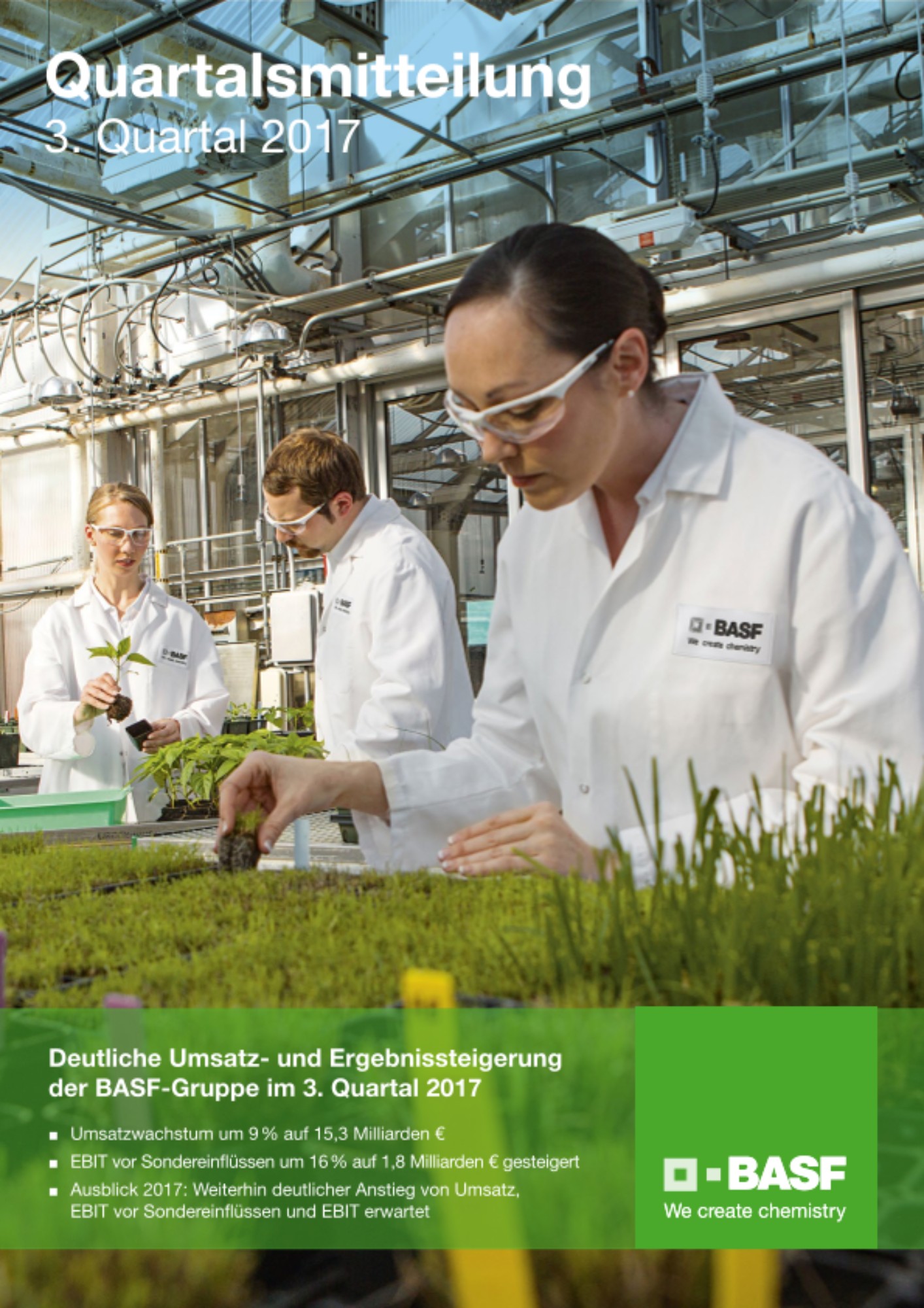 Im dritten Quartal 2017 verzeichnete die BASF-Gruppe eine deutliche Steigerung bei Umsatz und Ergebnis. „Die Nachfrage hat sich auch im dritten Quartal anhaltend positiv entwickelt. Wir erzielten ein solides Mengenwachstum gegenüber dem durchaus starken Vorjahresquartal“, so Dr. Kurt Bock, Vorsitzender des Vorstands der BASF SE.