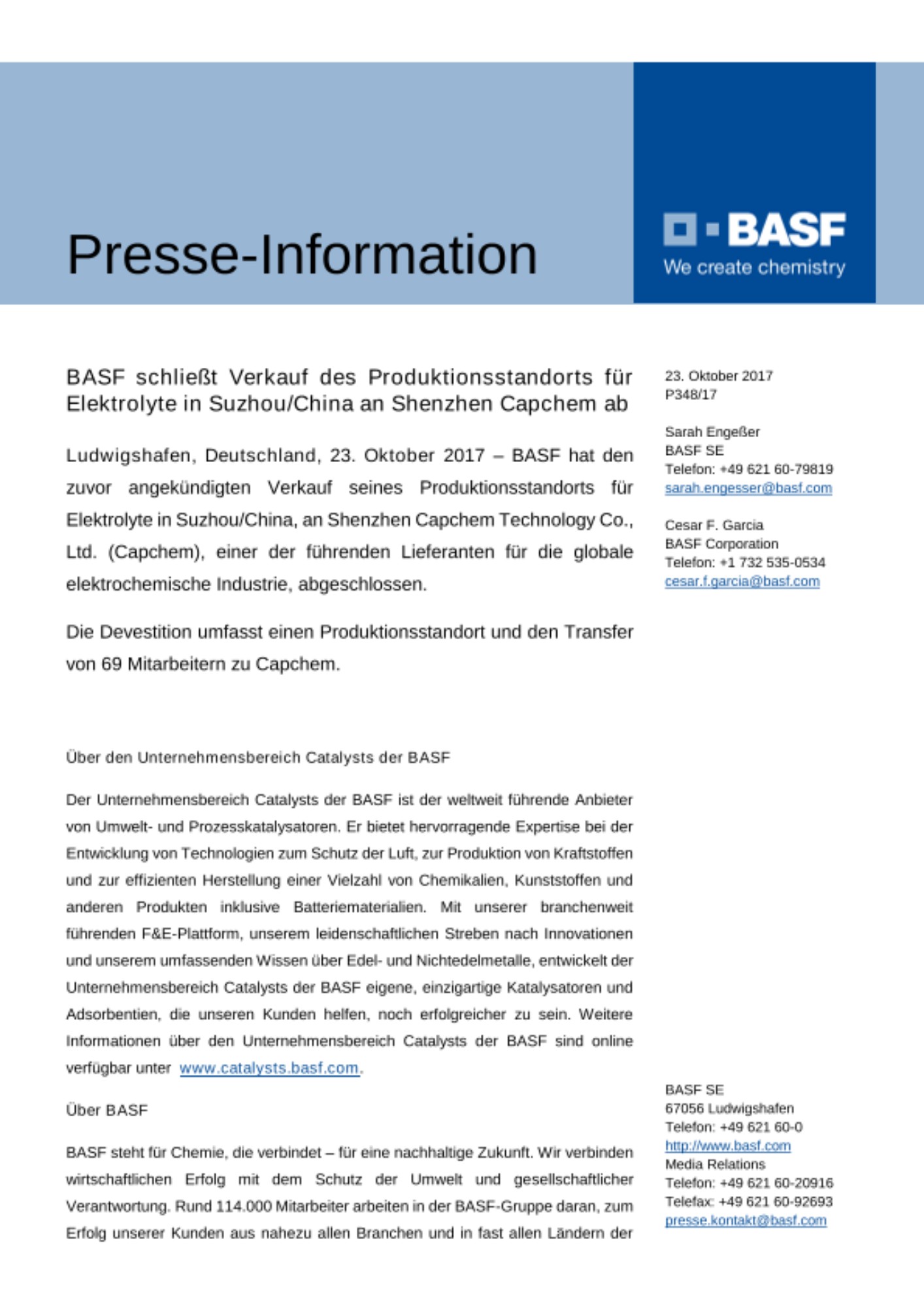 Ludwigshafen, Deutschland, 23. Oktober 2017 – BASF hat den zuvor angekündigten Verkauf seines Produktionsstandorts für Elektrolyte in Suzhou/China, an Shenzhen Capchem Technology Co., Ltd. (Capchem), einer der führenden Lieferanten für die globale elektrochemische Industrie, abgeschlossen.