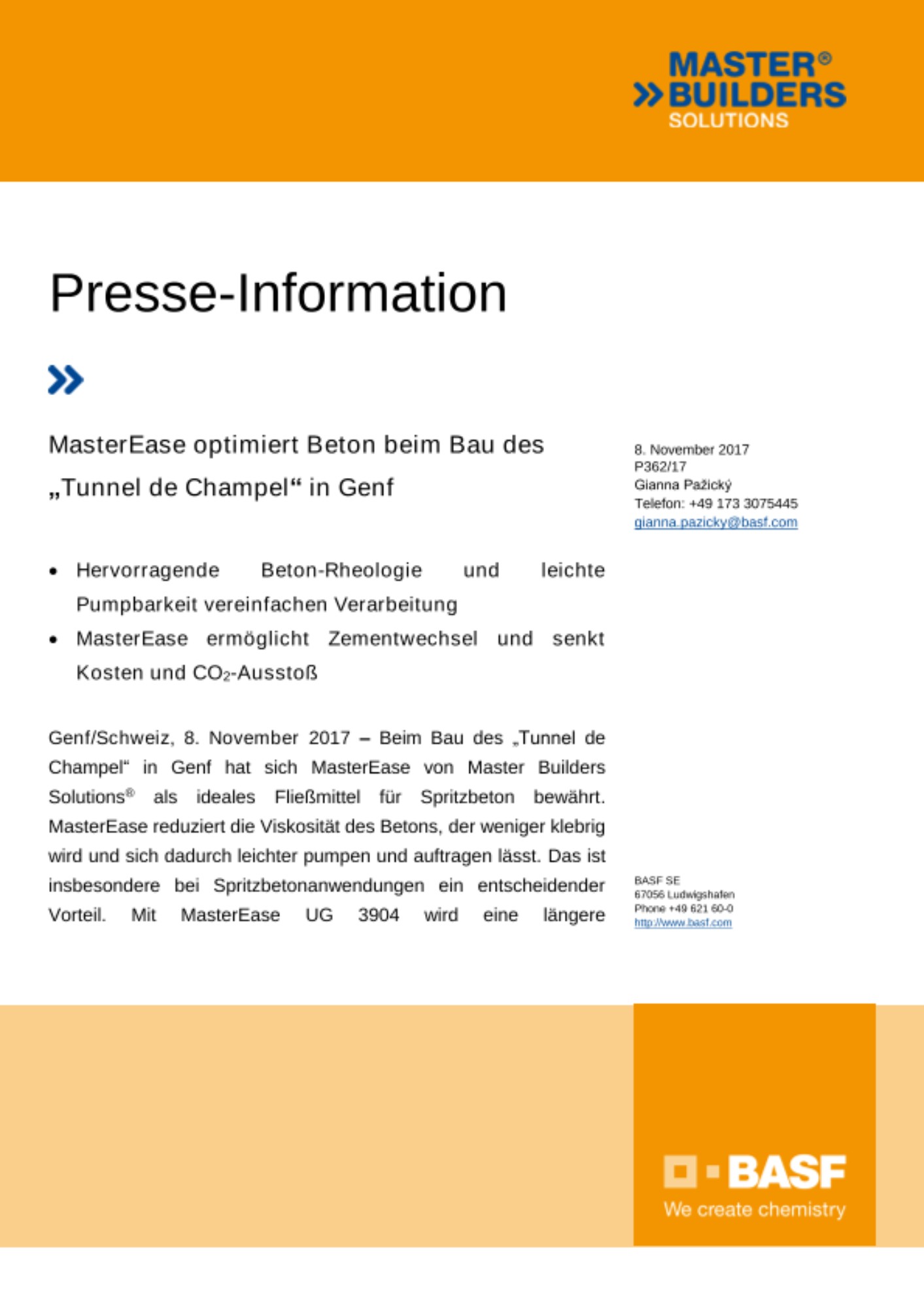 Die Erfolgsgeschichte von MasterEase UG 3904 im „Tunnel de Champel“ ist Teil der Nachhaltigkeitskampagne „Quantified Sustainable Benefits – Reduce Your Footprint and Boost Your Bottom Line“ von Master Builders Solutions. Die Kampagne wurde 2017 europaweit ausgerollt. Im Vordergrund stehen Projekte, bei denen Kunden dank der hochentwickelten Chemie von BASF ihre Produktivität steigern und gleichzeitig Kosten sowie Emissionen reduzieren konnten. In Anzeigenmotiven und auf einer eigenen Website zeigen die Master Builders Solutions-Experten von BASF gemeinsam mit europäischen Kunden ausgewählte Fälle, in denen sich durch hochwertige Chemie beim Kunden sowohl die Produktivität steigern als auch Betriebskosten und Emissionen senken lassen. Dank extern validierter Bewertungsinstrumente wie der Ökoeffizienz-Analyse oder dem Life Cycle Analyzer von BASF können die erreichten Erfolge quantifiziert werden.
