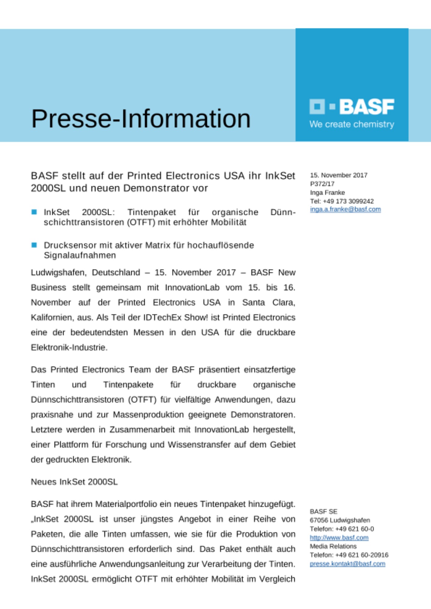 Ludwigshafen, Deutschland – 15. November 2017 – BASF New Business stellt gemeinsam mit InnovationLab vom 15. bis 16. November auf der Printed Electronics USA in Santa Clara, Kalifornien, aus. Als Teil der IDTechEx Show! ist Printed Electronics eine der bedeutendsten Messen in den USA für die druckbare Elektronik-Industrie.
