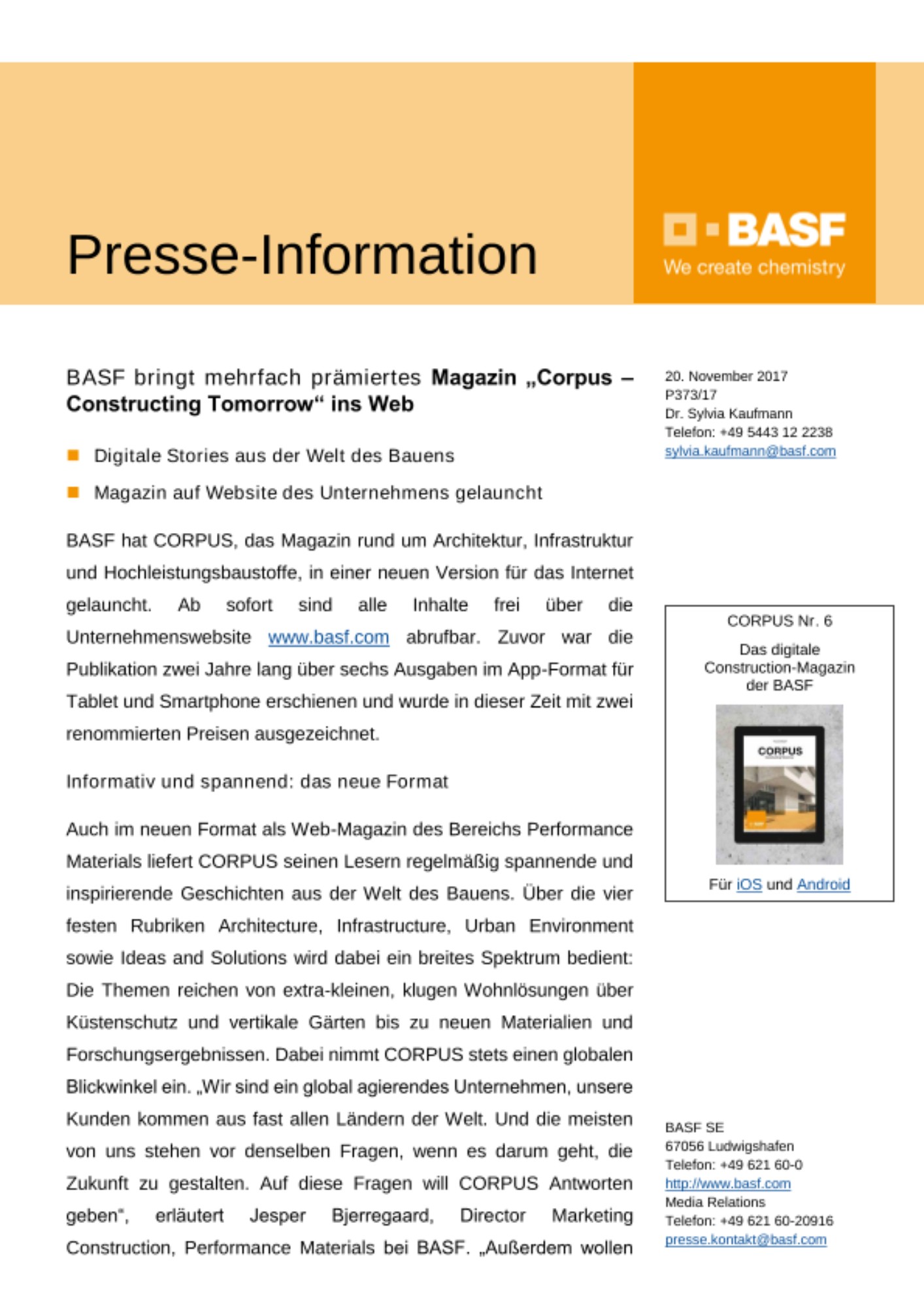 CORPUS ist unter https://www.basf.com/en/products-and-industries/plastics-rubber/corpus.html erreichbar, die Inhalte stehen auf Deutsch und Englisch zur Verfügung und werden regelmäßig aktualisiert. Momentan lesen Besucher zum Beispiel über den neuen Hochleistungsdämmstoff SLENTITE® und neue nachhaltige Konzepte der Architektur für die Innenstädte der Zukunft. Die App-Version des Magazins wurde 2016 mit dem German Design Award und 2017 mit dem Best of Content Marketing Award in Silber ausgezeichnet.